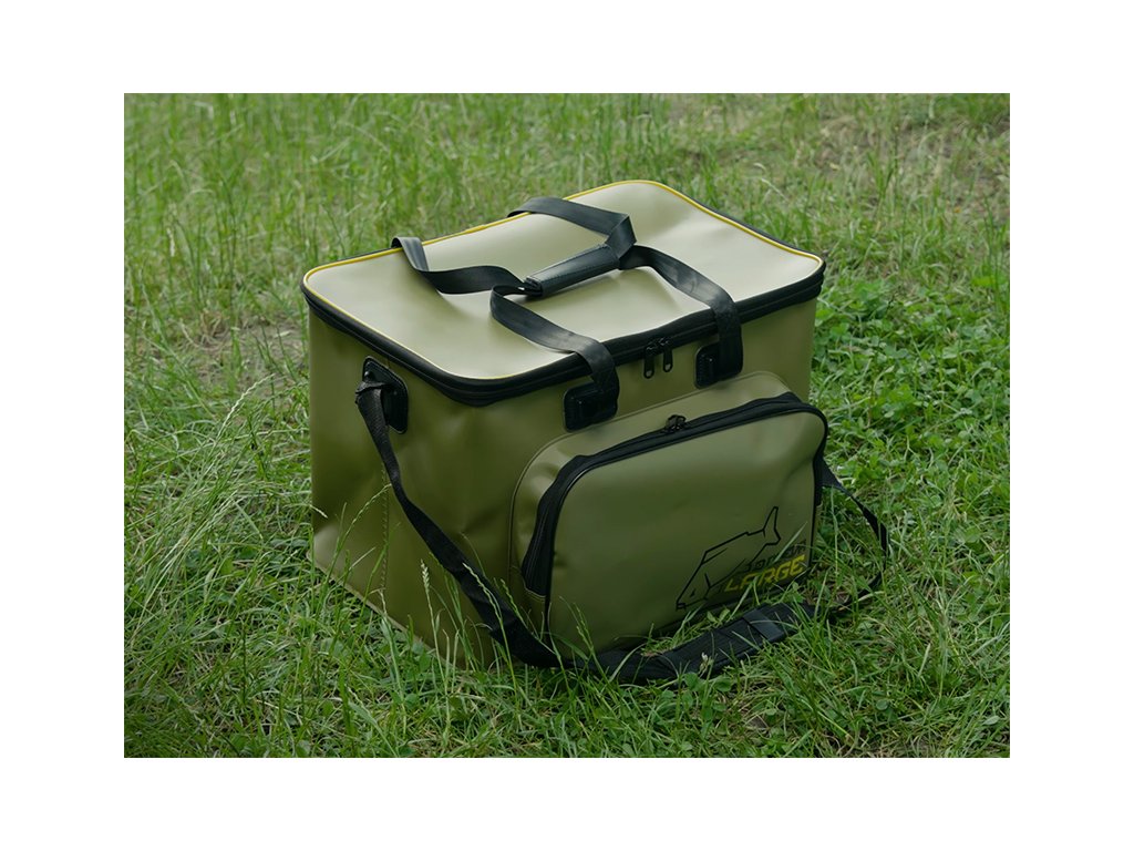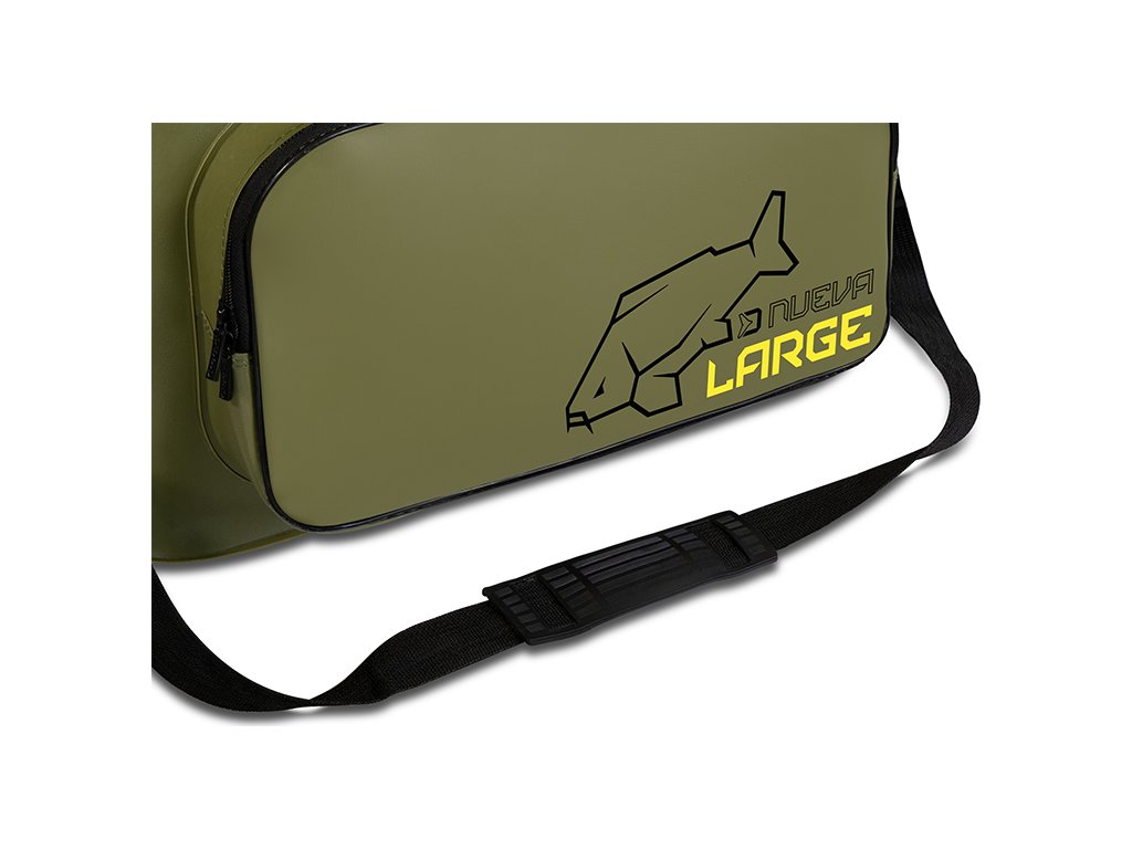 CarryAll taška Delphin NuEVA Large o rozměrech 45x30x35cm je univerzální rybářská taška vyrobená z EVA materiálu, poskytující velkorysý prostor pro uskladnění nejrůznějšího rybářského vybavení či různých nástrah a návnad. Díky použitému EVA materiálu a kvalitním svárům je taška nepromokavá, čímž dokonale ochrání obsah uvnitř i v nepříznivých povětrnostních podmínkách. Kromě nepromokavosti je tento materiál také velmi snadno omyvatelný a neabsorbuje pachy. Bez obav tak uvnitř můžete přenášet také různé tekuté potravy, dipy či boostry. Extra prostor pro drobnější příslušenství poskytuje zipovatelná kapsa na přední straně. Série tašek NuEVA je designována v kombinaci decentní barvy s logem kapra, což potěší množství příznivců kaprařiny. Pro snadný transport je taška opatřena praktickým, délkově nastavitelným popruhem na rameno, ale také dvěma popruhy do ruky. Rozměr: 45x30x35cm Rozměr přední kapsa: 35x20x6cm
