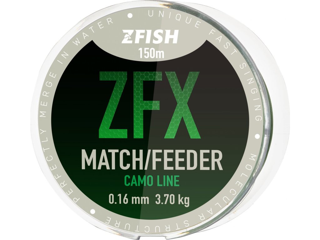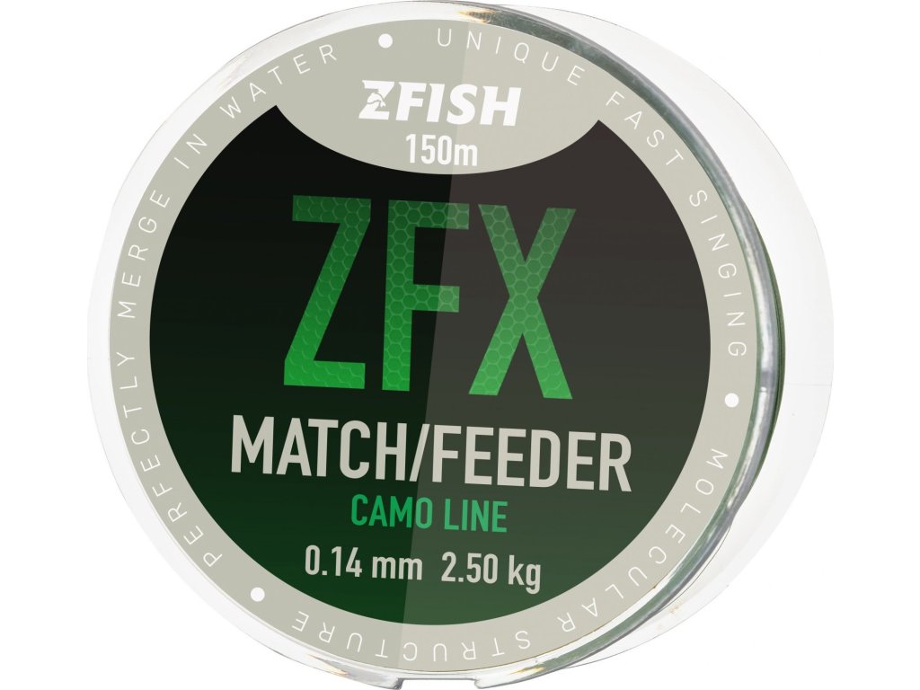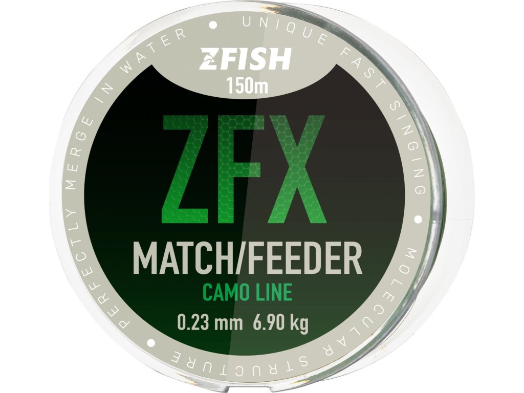 ZFISH vlasec ZFX Match/Feeder CamoLine to je unikátní, rychle potápivý vlasec na feeder a plavanou s jedinečnou CAMO vlastností. Tento specilání vlasec je vyráběn jedinečným procesem, při kterém se do vlasce implementuje molekularní struktura mikročástic a to má za výsledek zcela unikátní vzhled a vizuální vlastnosti tohoto materiálu. Tento vlasec dokonale a přirozeně splyne s podvodním prostředím a planktonem a pro ryby se stává prakticky neviditelným a vůbec je neruší. Dalšími důležitými vlastnostmi jsou jeho nízký průtah, již zmiňované rychlé potápění, nosnost a odolnost proti oděru.