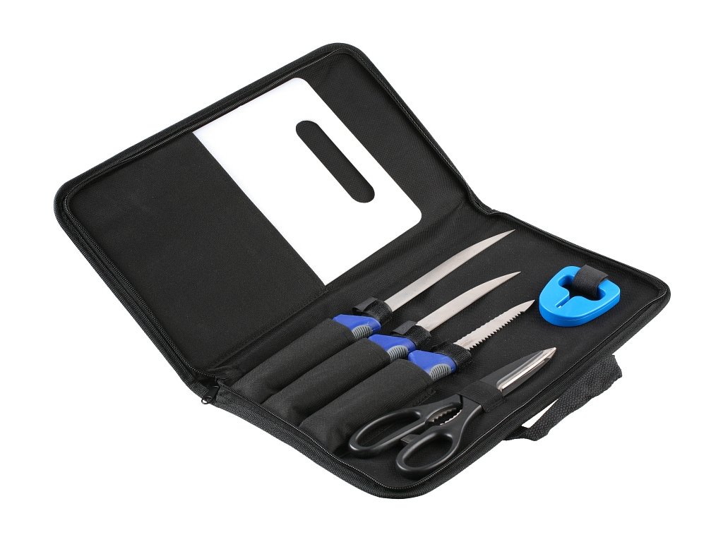Sada pro filetování ryb. Sada je uložena v odolném pouzdře, skládá se ze tří nožů, nůžek na kosti, prkénka a brousku. Vhodné také jako dárek, který potěší každého rybáře.