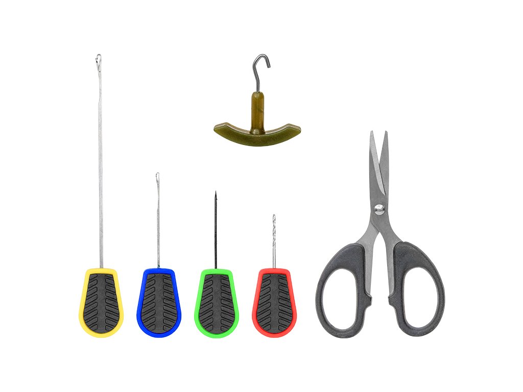 Praktická sada sestávající ze tří různých navlékacích jehel, vrtáku na boilies, testovače a utahováku uzlů a praktických nůžek. Navlékací jehly jsou v provedení s ochranným krytem. Nůžky jsou určeny na stříhání vlasců, ale i splétaných šňůr. Je to praktická pomůcka, která by neměla chybět ve výstroji žádného rybáře.