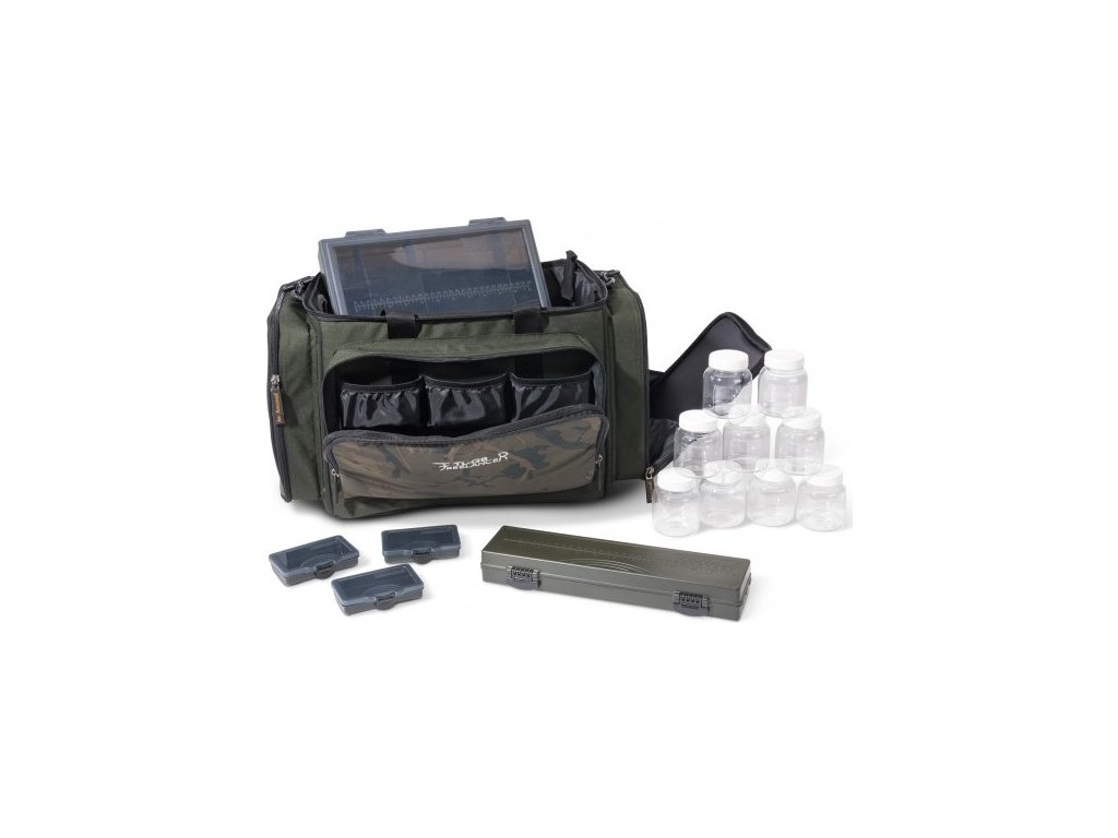 Multifunkční taška na rybářské potřeby. Dostatečný prostor, spousta kapes a 5 organizačních boxů umožňuje bezpečné přenášení rybářského vybavení. Stěny tašky mají vzpěry a drží stejný tvar, vrchní část je vyztužena a proto ji lze použít jako stoleček. Na vrchní části je elastickými pásky připevněn organizační box. Uvnitř tašky je organizér, v přední kapse jsou umístěny další organizační boxy. Součástí tašky je i 9 plastových dóz s gumovým těsněním na dipované nástrahy. Taška má praktická ucha a polstrovaný ramenní popruh.- Rozměry: 53 x 35 x 40 cm