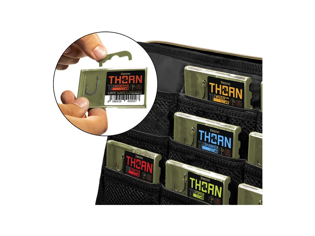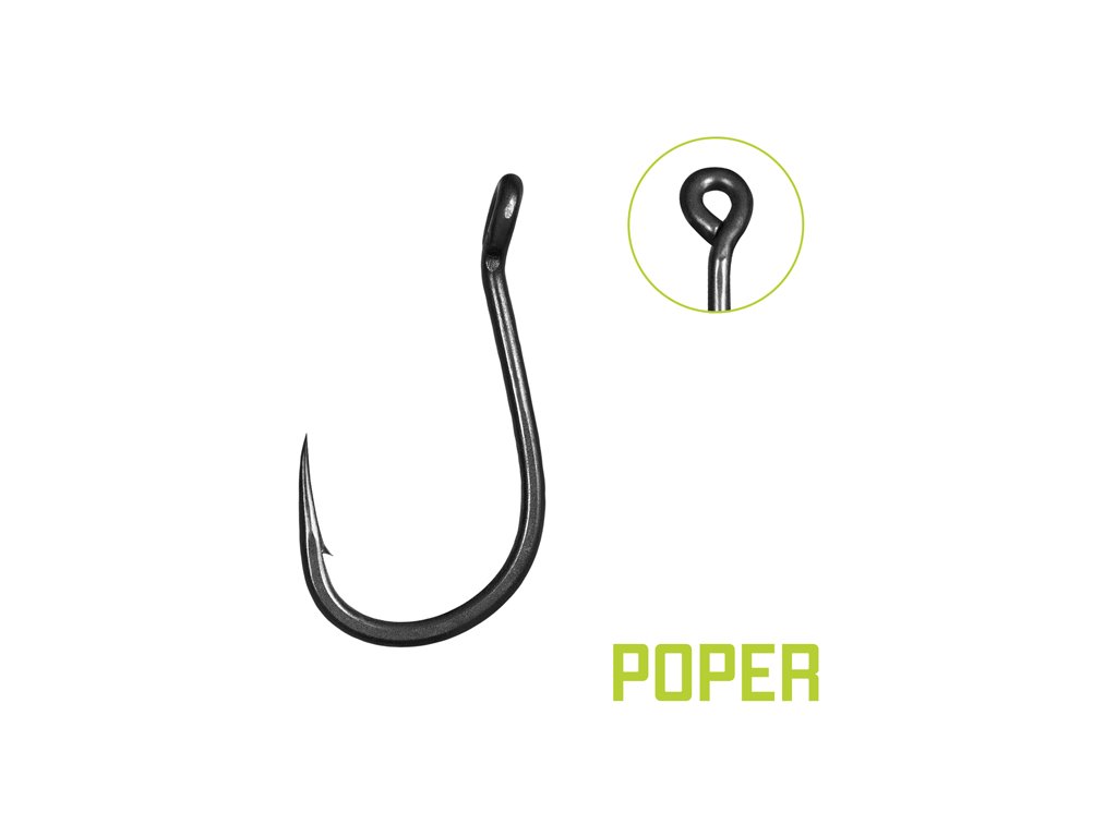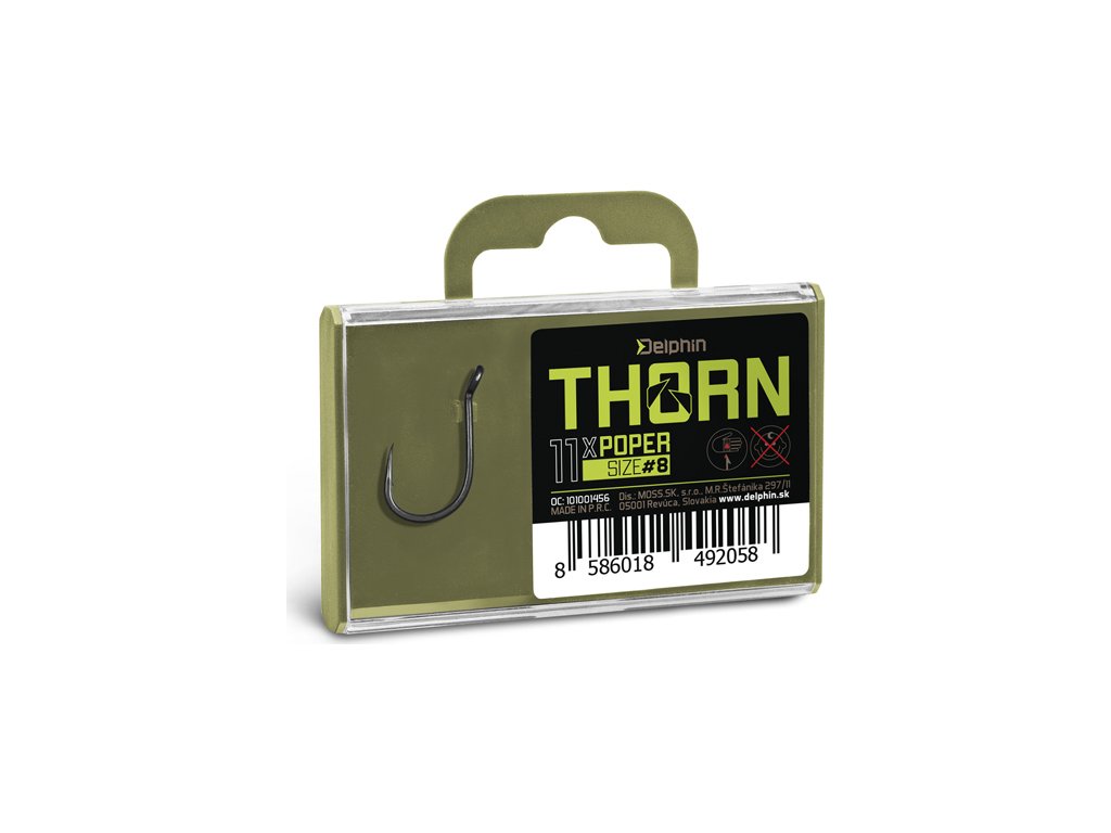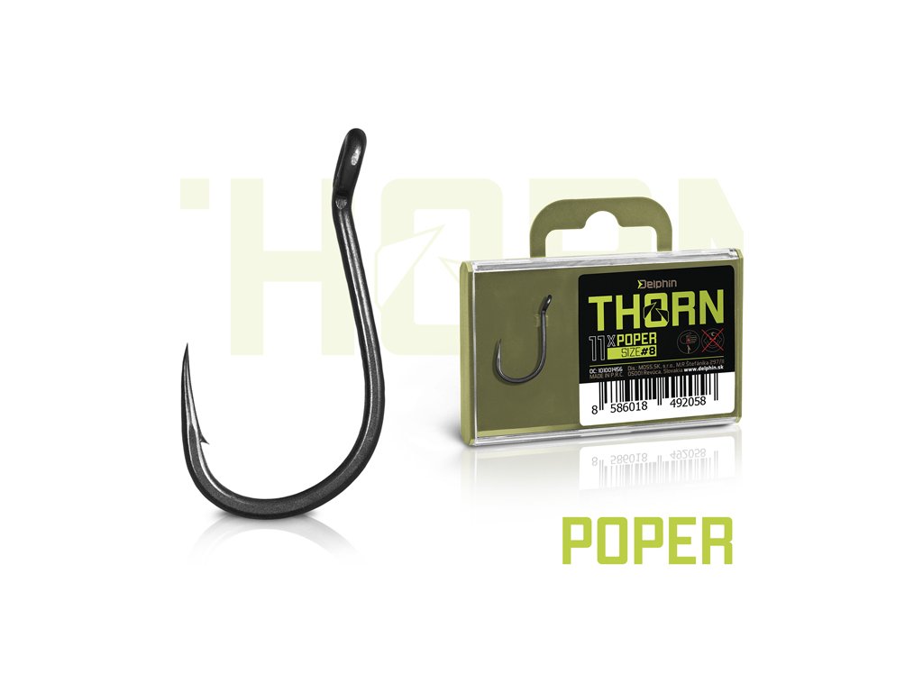 Delphin THORN je prémiová řada kaprařských háčků nejvyšší kvality. Díky moderním technologiím, které byly použity při výrobě jsou tyto háčky synonymem nekompromisní pevnosti a maximální ostrosti. Háčky ze série THORN disponují titanX povrchovou úpravou, čímž nabývají matný šedý povrch, který je navíc dokonale hladký pro snadné proniknutí do kapří tlamy. TitanX se stará také o zpevnění a odolnost celého háčku. Pomocí aplikované technologie Ultrapoint 4.8, bylo možné vytvořit delší hrot, který poskytuje přímo neuvěřitelnou ostrost. Háčky Delphin THORN jsou balené v praktické krabičce, ve které bude jejich ostří vždy důkladně chráněné. Na krabičce se navíc nachází držák s očkem pro zavěšení do prodejen, který lze snadno odstranit odlomením bez jakéhokoli nástroje díky čemuž krabička ve vaší výbavě zabere podstatně méně místa. THORN Poper je háček specifický očkem vyhnutým do vnější strany. Takové provedení ho předurčuje především pro použití s pop-up nástrahami. Výborně se hodí na tvorbu montáží jako Chod rig, Multi rig, Zig rig a podobně. Díky mírnému zakřivení hrotu dovnitř bude po záseku dokonale sedět v kapří tlamě. Technický parametr: háček osově rovný