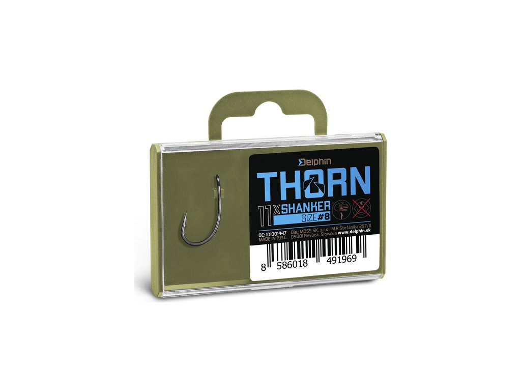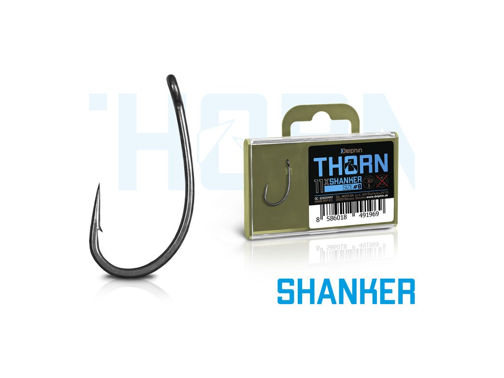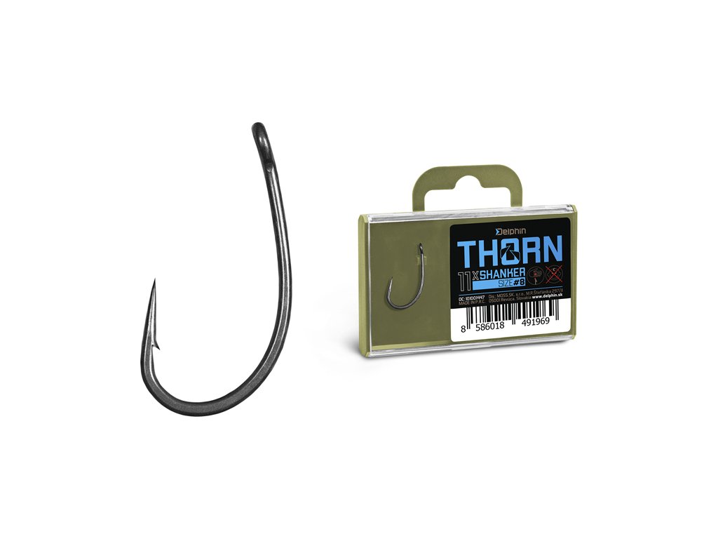 Delphin THORN je prémiová řada kaprařských háčků nejvyšší kvality. Díky moderním technologiím, které byly použity při výrobě jsou tyto háčky synonymem nekompromisní pevnosti a maximální ostrosti. Háčky ze série THORN disponují titanX povrchovou úpravou, čímž nabývají matný šedý povrch, který je navíc dokonale hladký pro snadné proniknutí do kapří tlamy. TitanX se stará také o zpevnění a odolnost celého háčku. Pomocí aplikované technologie Ultrapoint 4.8, bylo možné vytvořit delší hrot, který poskytuje přímo neuvěřitelnou ostrost. Háčky Delphin THORN jsou balené v praktické krabičce, ve které bude jejich ostří vždy důkladně chráněné. Na krabičce se navíc nachází držák s očkem pro zavěšení do prodejen, který lze snadno odstranit odlomením bez jakéhokoli nástroje díky čemuž krabička ve vaší výbavě zabere podstatně méně místa. THORN Shanker je díky svému tvaru typickým zástupcem háčků z kategorie curved shank. Háček s takovým zakřivením je doslova zasekávací mašinou a při správně navázané montáži se Shanker, si můžete být jisti, že ztrátovost ryb se bude blížit k nule. Ideálně se hodí pro lov s potápivými nástrahami, ale také ho lze použít při chytání s pop-up. Technický parametr: háček osově rovný