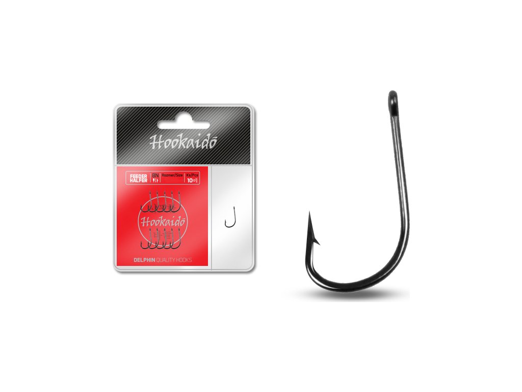 Háčky červené série Delphin HOOKAIDO jsou určeny pro každodenní rybolov. Jsou velmi odolné, ostrost a tvar neztrácejí ani po delším používání a mnoha zdolaných rybách. Vyrobené jsou jen z materiálů vysoké jakosti. Díky pestrosti tvarů a velikostí si z této série vybere každý rybář ten svůj! Asymetrické balení 10 + 1 umožňuje rybářům jednodušší výběr potřebného háčku. Delphin HKD Feeder HALFER je háčkem určeným primárně pro lov s živočišnými nástrahami. Menší velikosti se výborně hodí pro velmi jemný a citlivý lov. Technické parametry: - s očkem - s protihrotem - osově zakřivený - průřez: kulatý