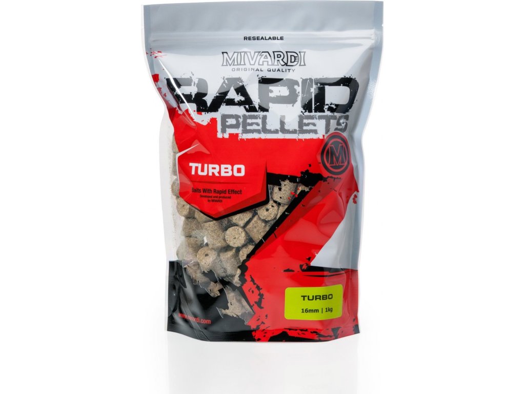 Nová série pelet s extrémně rychlým účinkem. Zahájení rozpadu prakticky okamžité a ke kompletnímu rozpadu dochází v závislosti na teplotě vody a použitém průměru pelet během 10 - 60 minut. Jsou určeny k rychlému rozkrmení místa. Směs s vysokým podílem olejnatých semen napomáhá intenzivnímu uvolňování částic i chuťové stopy do celého vodního sloupce. Proto jsou pelety turbo vhodné jako speciální návnada při použití metody zig rig. Pelety neobsahují přidané aroma ani barvivo a jsou vyrobeny ze 100% přírodních složek.