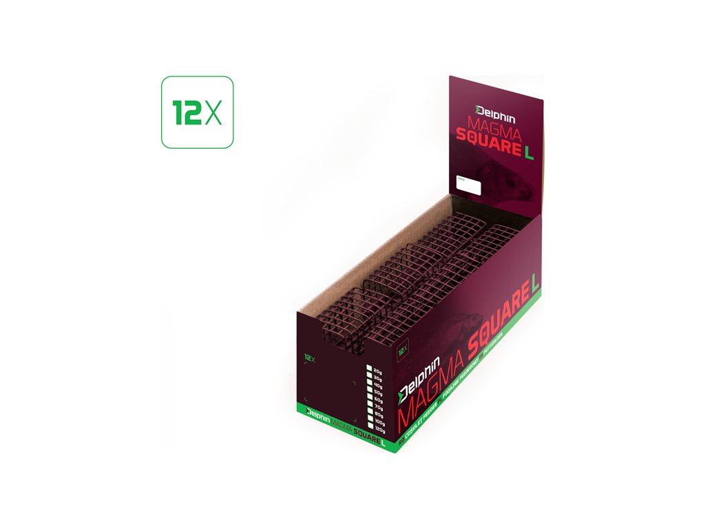 Jedinečné feederové krmítko navržené společností Delphin v unikátním MAGMA designu. Základ krmítka tvoří košík hranatého tvaru, který je vyroben z pevného drátu. Ten zabraňuje protlačení během plnění krmivem, které se ve vodě z něj výborně uvolňuje. Na spodní části se nacházejí čtyři špičaté výstupky, díky kterým krmítko lépe drží na dně a je tak omezeno jeho posouvání hladovými rybami, či říčním proudem. Osazené je obratlíkem na prodloužené pohyblivé části pro pohodlné upevnění k feederové sestavě. V nabídce je v různých gramážích a taktéž ve třech velikostech: S, M a L. Každý příznivec feederu si tak vybere to správné pro danou situaci a typ vody. Technické parametry: Velikost košíku S: 35x28x25mm Velikost košíku M: 49x31x29mm Velikost košíku L: 52x33x30mm