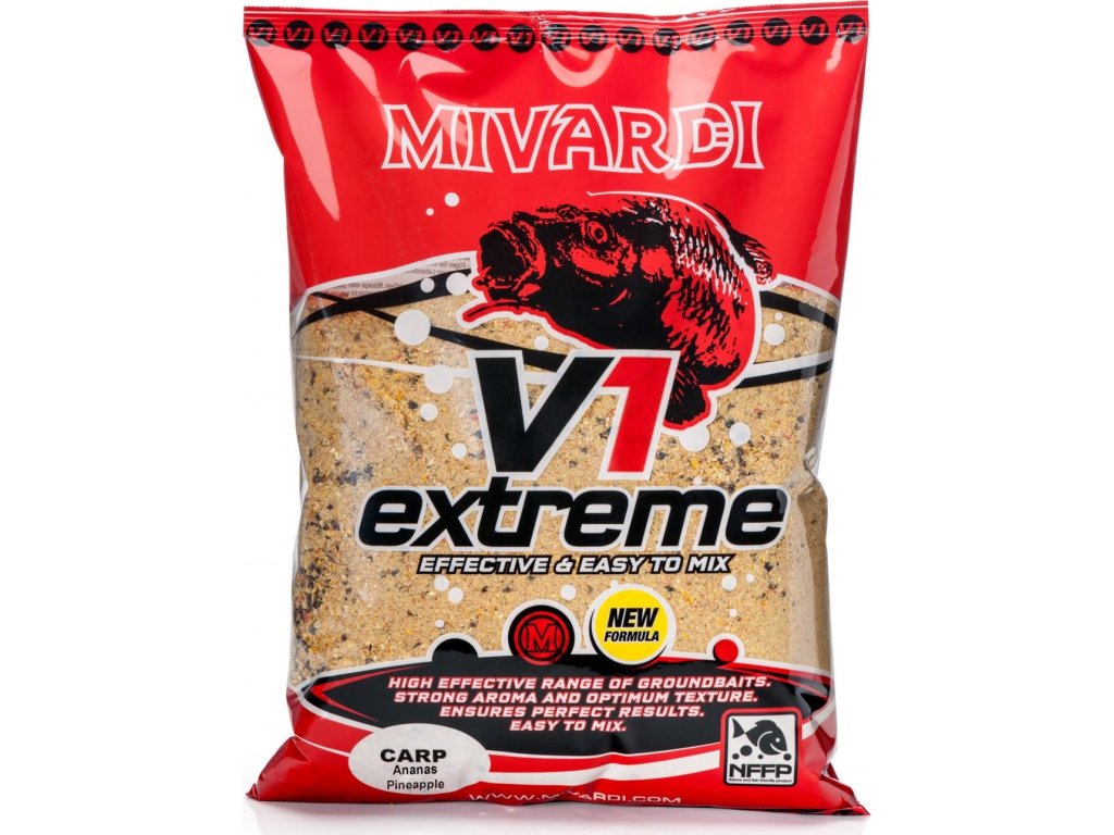 Nová generace základních krmiv v ekonomicky výhodném 2850 gr. balení. Krmiva jsou vhodná pro použití do krmítek i pro vnadění rukou. Základem těchto krmiv jsou podobně jako u těch nejlepších řad mletá aromatizovaná pečiva, biskvity, semínka a další skutečně účinné komponenty. Díky tomu mají krmiva V1 mnohem vyšší účinnost než běžná krmiva za podobnou cenu, která jsou postavena na „ochucených šrotech“. Již při pohledu na krmení V1 v suchém stavu je zřejmé, že obsahuje skutečné komponenty různých zrnitostí a tím zajišťuje správnou konzistenci a optimální práci po vhození do vody. Velmi světlé a silně aromatické krmení s hrubou strukturou a velkou účinností na kapry a velké ryby. Funguje výborně především v teplejším období.