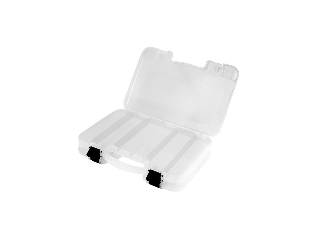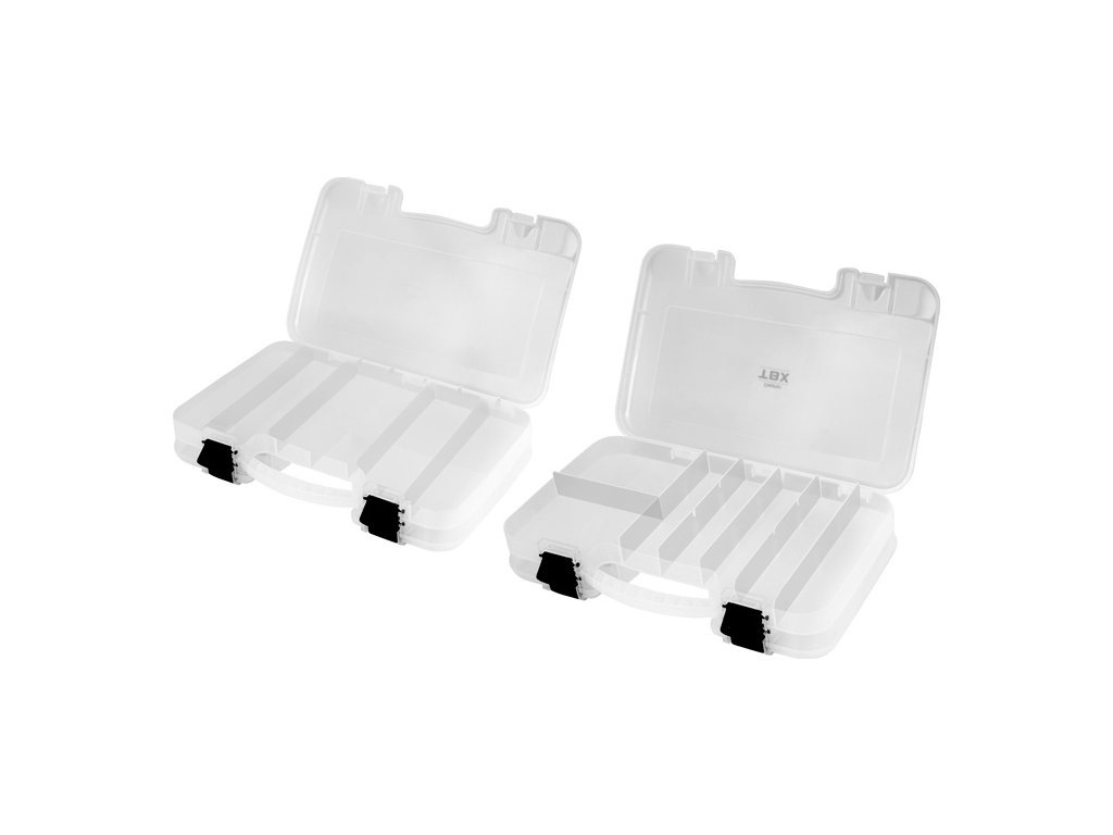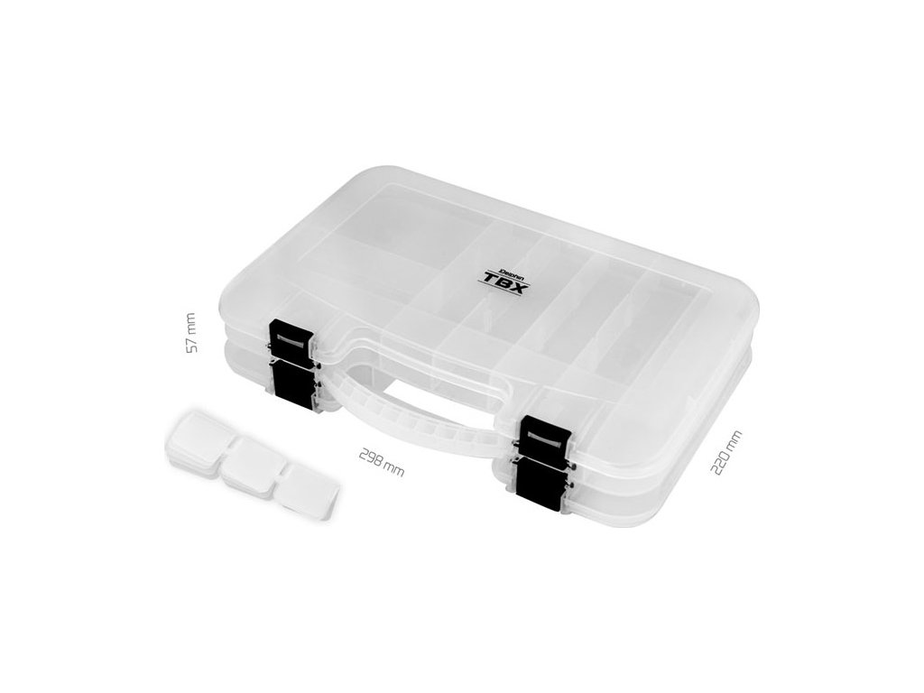 TBX Duo 298-12P Clip je multifunkčná krabička určená na uloženie rybárskeho príslušenstva. Vyrobená je z transparentného plastu, takže máte vždy prehľad o uložených veciach vo vnútri krabičky. DUO znamená dva oddelené úložné priestory a to jeden z vrchnej a druhý zo spodnej časti s dômyselným otváraním. Vybavená je praktickými externými klipmi z čierneho plastu. Má zabudovanú pevnú rúčku pre jednoduchší transport. Technické parametre: Rozmer: 298x220x57mm Počet pevných priehradiek: 12 Rozmer priehradky: 1x(8,5x16,7x2,5cm), 4x(5x16,7x2,5cm), 5x(3,5x16,7x2,5cm), 2x(9,5x10,8x2,5cm) Počet vkladateľných priečinkov: 8
