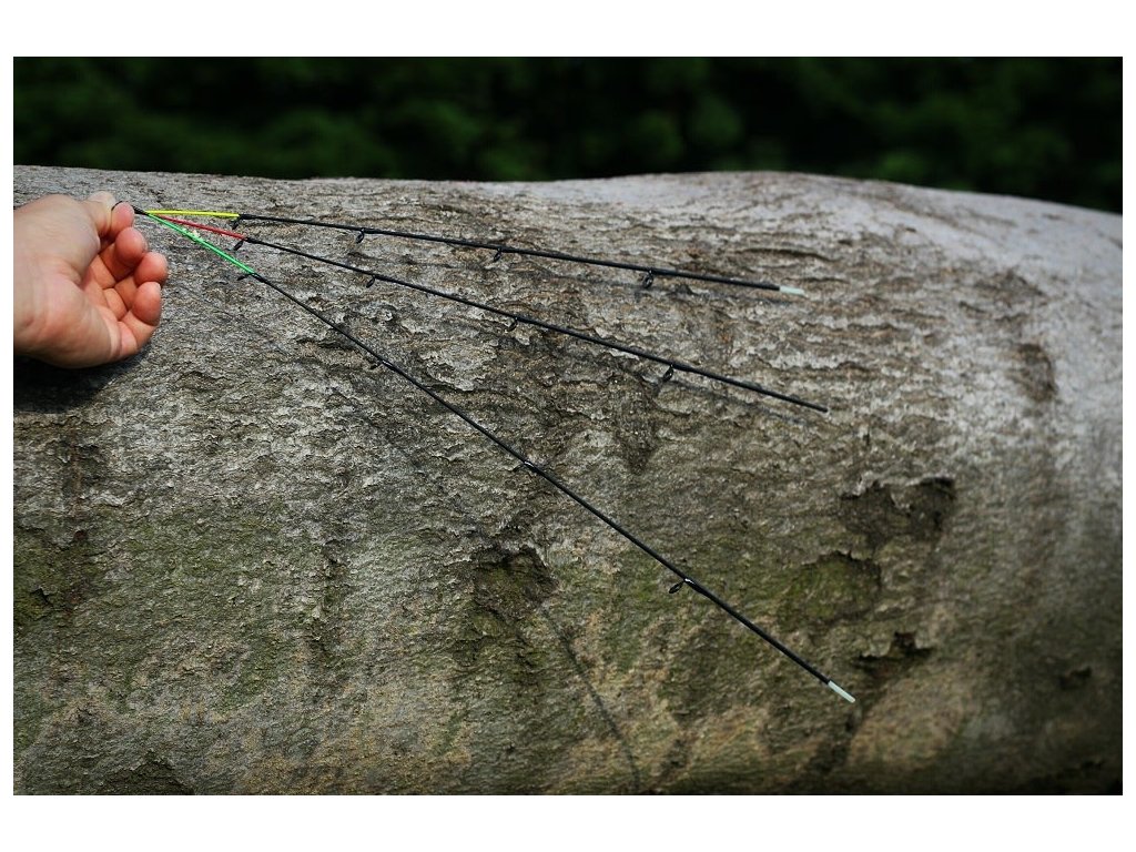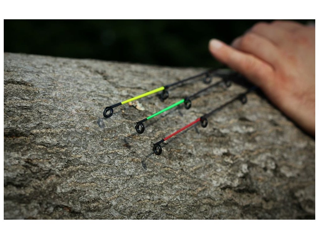 Souhrn špiček dodávaných k prutu: žlutá – tužší (sklolaminátová), červená - střední tuhost (grafitová) a zelená – jemná (sklolaminátová).