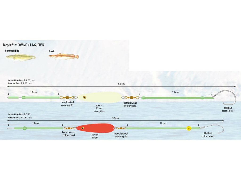 Kompletní set sestavený pro lov se "Sea-boom", tedy systémem proti zamotání, který udržuje správnou vzdálenost mezi sestavou a zátěží. Určený především k lovu Mníka mořského a bělolemého, na filety a mrtvou rybu. Je osazena vábící třpytkou, která přitahuje krmící se ryby a provokuje je k záběru.