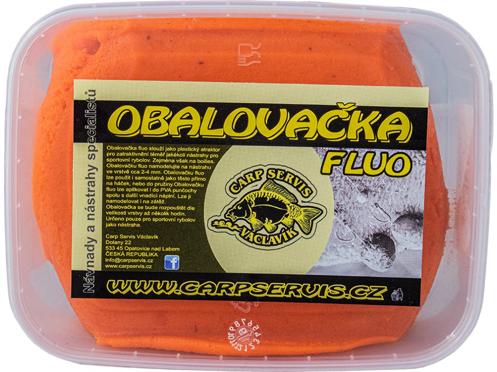 Obalovačka Fluo slouží jako plastický atraktor pro zatraktivnění téměř jakékoli nástrahy pro sportovní rybolov, zejména však na boilies Boss2 a produkty CSV, které svým zaměřením kopírují. Obalovačku Fluo namodelujete na nástrahu ve vrstvě cca 24 mm. Je nositelem nejen mnoha dráždivých pachů, ale její největší předností je právě fluo zbarvení, které prokazatelně umocní zájem ryb. Lze použít i samostatně jako těsto přímo na háček nebo lépe do pružiny. Obalovačka Fluo se bude rozpouštět dle namodelované síly vrstvy až několik hodin.