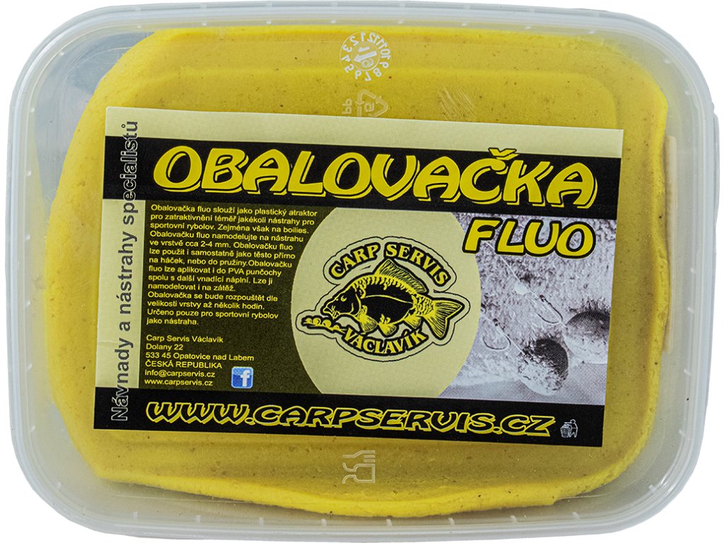Obalovačka Fluo slouží jako plastický atraktor pro zatraktivnění téměř jakékoli nástrahy pro sportovní rybolov, zejména však na boilies Boss2 a produkty CSV, které svým zaměřením kopírují. Obalovačku Fluo namodelujete na nástrahu ve vrstvě cca 24 mm. Je nositelem nejen mnoha dráždivých pachů, ale její největší předností je právě fluo zbarvení, které prokazatelně umocní zájem ryb. Lze použít i samostatně jako těsto přímo na háček nebo lépe do pružiny. Obalovačka Fluo se bude rozpouštět dle namodelované síly vrstvy až několik hodin.