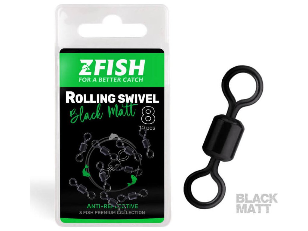 ZFISH Rolling Swivel Black Matt je naše vlajková loď mezi obratlíky. Jedná se o další produkt z řady “3Fish”, ale tento je navíc speciálně povrchově upraven do 100% antireflexní, matně černé barvy, která je velice odolná a nehrozí tak, že se obratlík po čase odře, nebo se barva začne odlupovat. Klasický, pevnostní obratlík v nejvyšší možné kvalitě materiálu i zpracování.