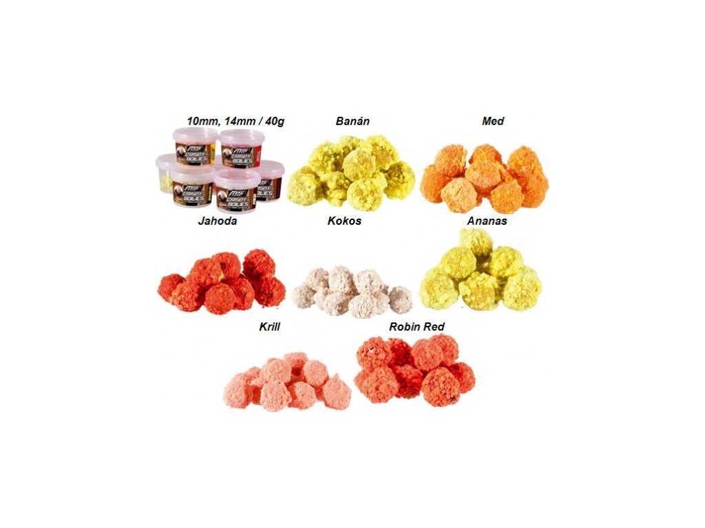 Toto aktivní, křupavé boilies se skládá z jádra a obalového materiálu, jádro je tvořeno klasickým boilies těstem, které je obaleno plovoucími pop-up částicemi, ty se postupně uvolňují a stoupají k hladině. Zatímco jádro leží na dně, stoupající částečky lákají ryby z vodního sloupce. Nástraha se tak stává pro mnoho ryb neodolatelnou.K dostání ve velikostech 10 – 14 mm, jedno balení má 40 g.Ananas, žlutáDoplňkové parametry