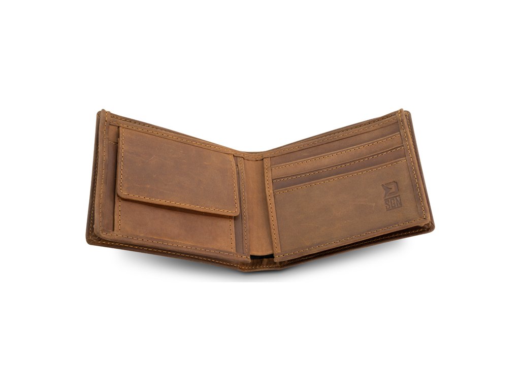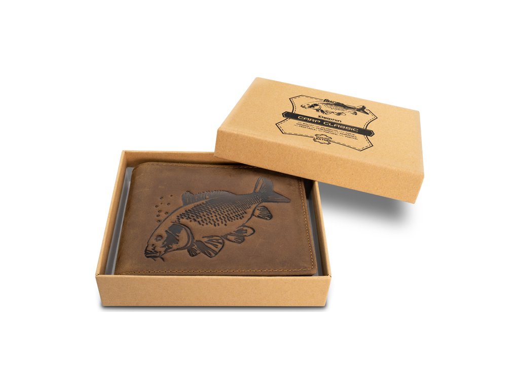 Stylová kožená peněženka vylepšená klasickým motivem kapra, která bezpečně uchová vaše doklady i hotovost. Obsahuje několik přihrádek na platební a zákaznické karty, zapínací kapsu určenou pro mince, případně žetony a samozřejmě nechybí dvě přihrádky pro uložení bankovek. Peněženka je vyrobena z pravé kůže tmavě hnědé barvy, díky čemuž se vyznačuje kvalitou, odolností a příjemně se drží v ruce.