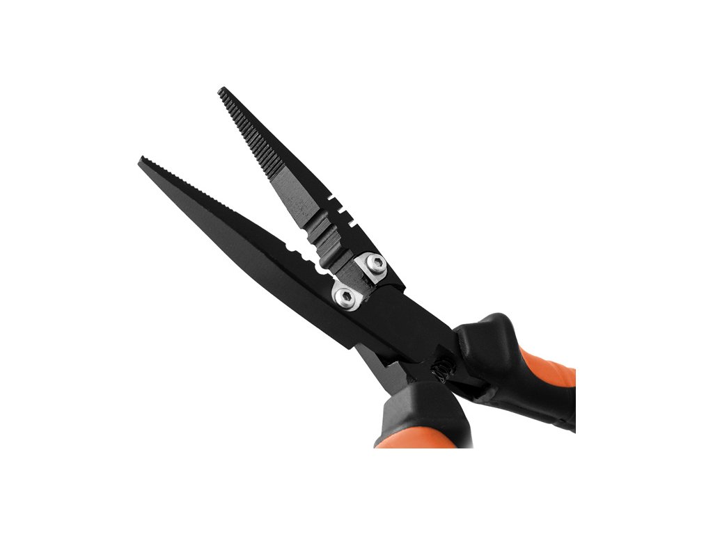 Delphin MULTI+CUT jsou dlouhé kleště se zabudovaným střihačem splétaných šňůr a vlasců. Jsou určeny pro vyprošťování háčků z tlam dravých ryb, v případech, kde na to klasický peán už nestačí. Jejich délka je 18cm. Vnitřní plocha kleští poskytuje dostatek gripu pro uchopení i velkých dvojháčků a trojháčků. Na čelistech se nachází také integrovaná část určená pro krimpování, s celkovou šířkou 9mm. Ramena kleští jsou vybaveny pružinou, která je udržuje otevřené a připravené pro okamžitou manipulaci. Jsou vyrobeny z oceli s vysokým podílem uhlíku a jejich obě rukojeti jsou vybaveny plastem oranžové a černé barvy, které jsou dobře viditelné za každých podmínek a dobře padnou do ruky. Na obou ramenech rukojeti se nacházejí otvory na provlečení šňůrky. S našimi kleštěmi MULTI+CUT dokážete od nynějška rybu rychle a bezpečně zbavit zaseknutých háčků.