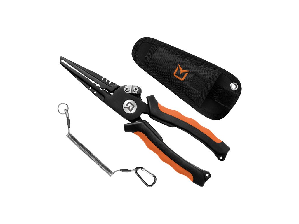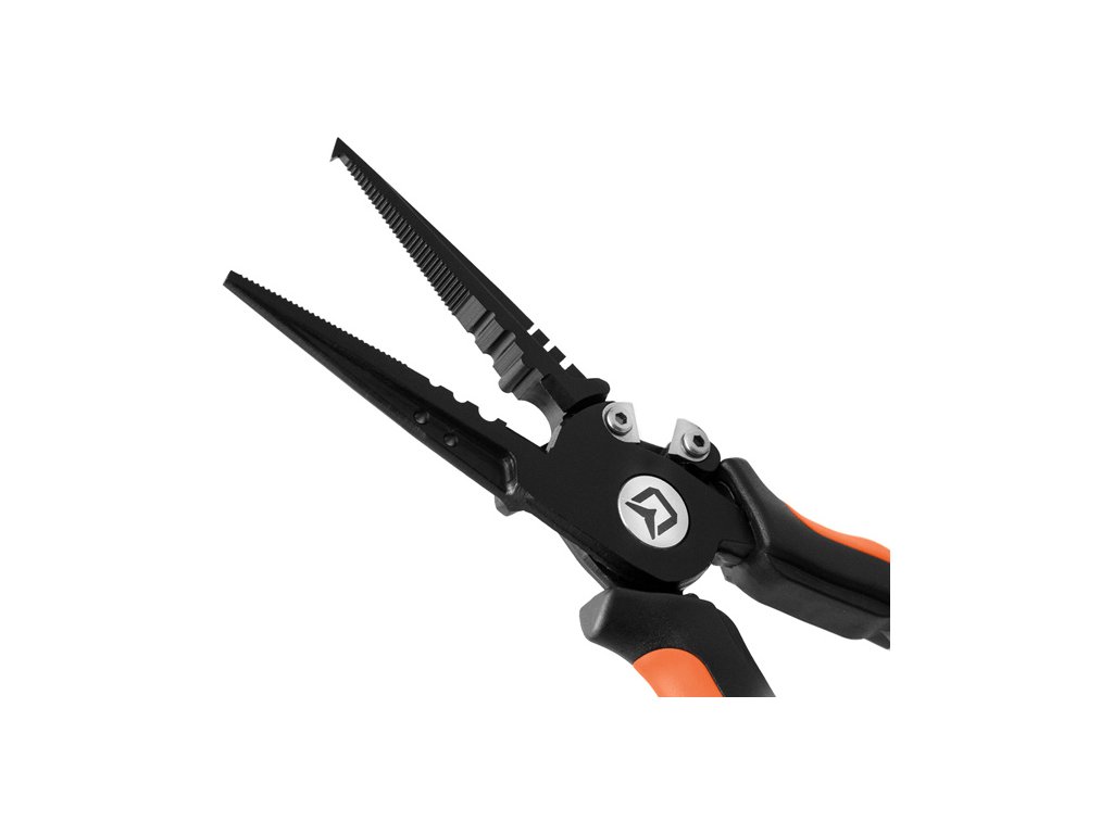 Delphin PROFISET jsou kleště s otvírákem kroužků a s postranním střihačem splétaných šňůr a vlasců. Jsou určeny pro vyprošťování háčků z tlam dravých ryb, v případech, kde na to klasický peán už nestačí. Jejich délka je 18cm. Vnitřní plocha kleští poskytuje dostatek gripu pro uchopení i velkých dvojháčků a trojháčků. Jsou vyrobeny z nerezové oceli a jejich obě rukojeti jsou vybaveny plastem oranžové a černé barvy, které jsou dobře viditelné za každých podmínek a dobře padnou do ruky. S našimi kleštěmi PROFISET dokážete napříště rybu bezpečně zbavit uvízlých háčků, otevírat kroužky, stříhat návazce nebo krimpovat s hloubkou krimpovacích čelistí 9mm. Kleště jsou dodávány s praktickým černým pouzdrem na opasek a černým natahovacím lankem vybaveným na obou koncích karabinami. Na obou ramenech rukojeti se nacházejí otvory na provlečení šňůrky.