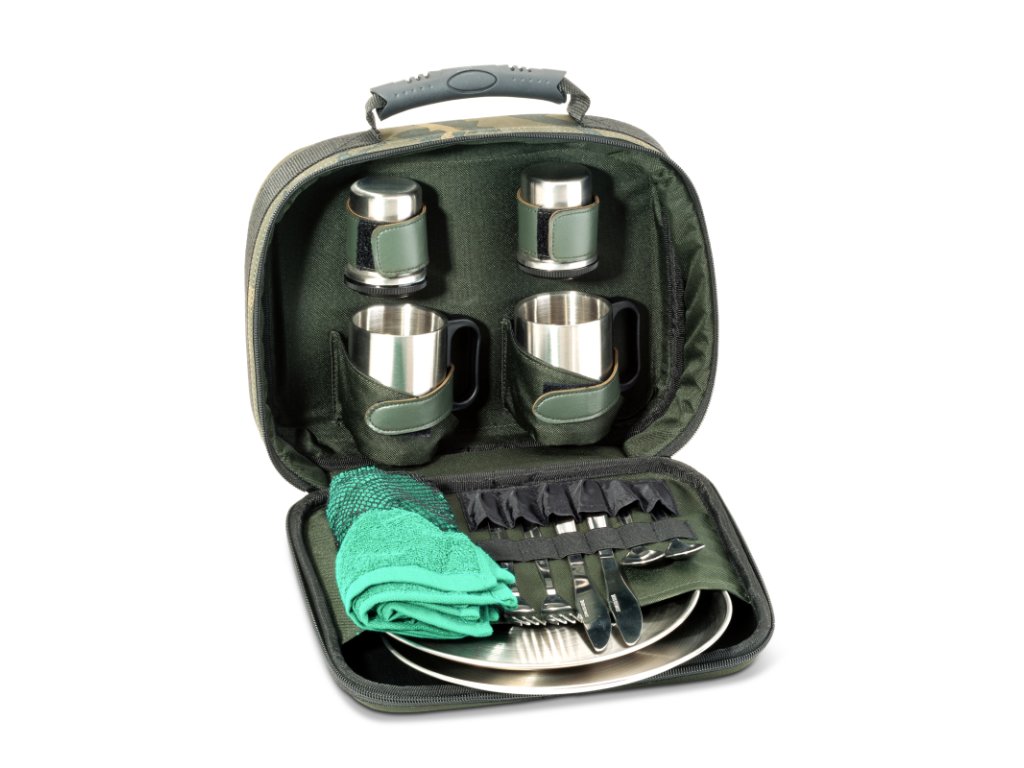 Tato taška je vybavena kompletní sadou příborů z nerezové oceli. Najdete zde dva nerezové talíře, nože, vidličky, kávové lžičky a hrnky. Tato sada obsahuje také nádobu na cukr, mléko a také ručník. Pouzdro má velmi pevné stěny, aby nedošlo k poškození nádobí.