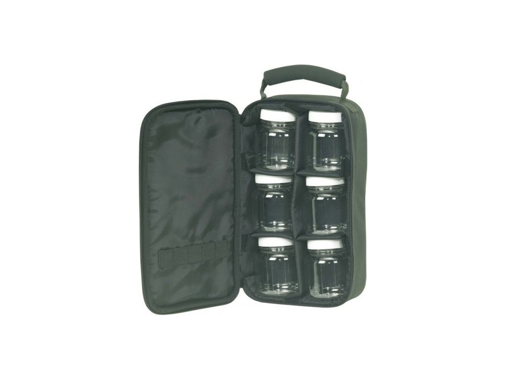 Silně polstrované pouzdro na nástrahy a návnady namočené v dipech apod. Taška obsahuje 6 průhledných nádob o objemu 100 ml. Dózy jsou lehce uzavíratelné, mají víčko s gumovým těsněním. Na víku je gumová páska k uchycení až pěti předmětů potřebných při manipulaci s materiálem v dózách. Například boilie jehly apod. Rozměry pouzdra jsou cca 29x 16x 8 cm. Taška je vyrobena z voděodolného polyesteru 600 x450D.- 6 dóz, 100 ml