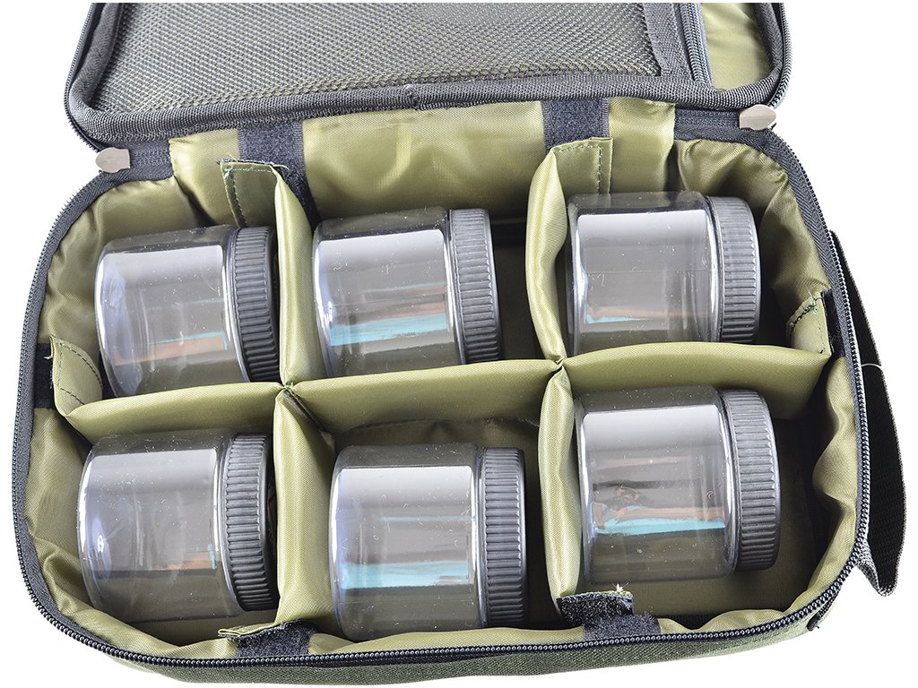 Taška se šesti přihrádkami a plastovými dózami na uchování a bezpečnou přepravu dipů.