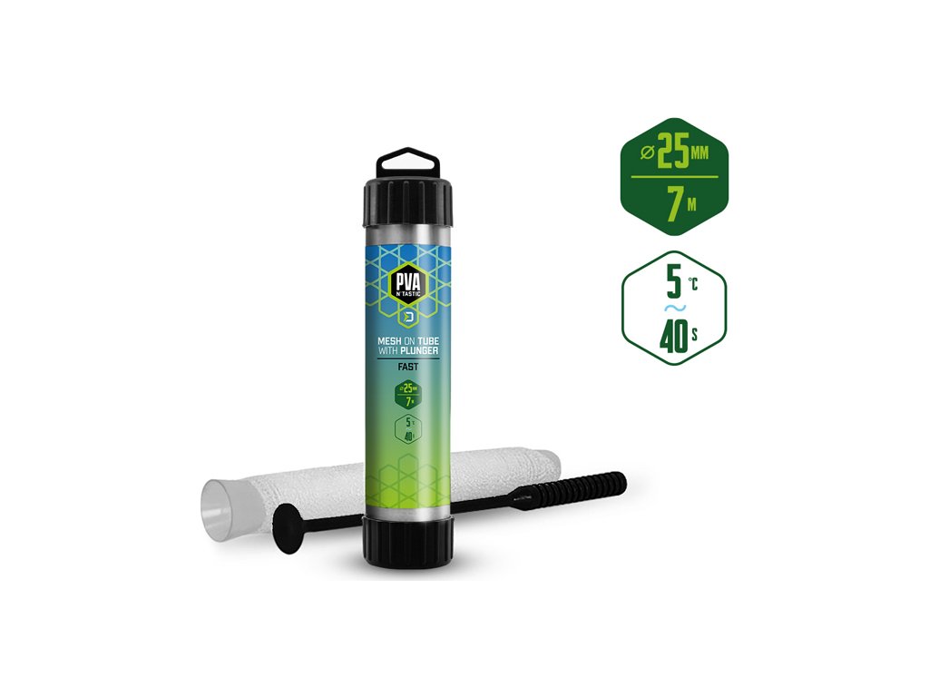 PVA punčocha s kratší dobou rozpadu je ideální pro lov během chladnějších měsíců, nebo při lovu v mělčích hloubkách, kde montáž klesá kratší dobu ke dnu. Jedná se o vysoce kvalitní produkt vyrobený v EU, při kterém díky důkladnému pletení nedochází ke svévolnému trhání punčochy a zároveň se výborně plní i velmi jemnými částicemi, čímž budete moci spolu s nástrahou poslat do vody i maximálně atraktivní návnadu přímo na montáži. Součástí balení je tuba a tlouk, které umožňují snadné plnění punčochy vnadící směsí. PVA punčocha se po čase přímo úměrném teplotě vody rozpustí a tak uvolní krmnou směs v bezprostřední blízkosti nástrahy, čímž výrazně zvýší její atraktivnost pro kaprovité ryby. Upozornění: PVA produkty jsou vodou rozpustné, manipulujte s nimi proto jen se suchýma rukama aby nedošlo k jejich deformaci či poškození. Technické parametry: Průměr: 25mm(úzká) Délka: 7m Doba rozpustnosti: cca 40s/5°C voda