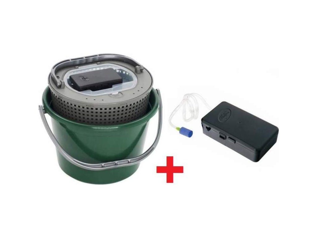 Bateriový vzduchovací motůrek, který je napájen dvěma bateriemi.