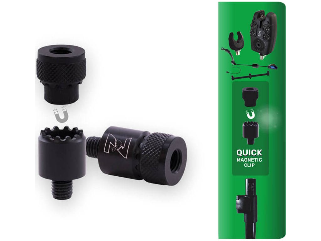 Jedinečná a vychytaná rychlospojka, která funguje s pomocí EXTRA silného magnetu a speciálního tvaru spoje, který do sebe pasuje a zaručí, že se části rychlospojky nebudou protáčet a sami se nerozpojí ani při prudkém záběru do strany. Do horní části spojky jednoduše našroubujte hlásič a spodní část klasicky namontujte na Váš stojan nebo vidličku. Po ukončení rybolovu jednoduše oddělíte a jednotlivé části ponecháte jak na hlásiči, tak na stojanu/vidličce. Při další výpravě stačí jen opět spojit a jste ušetřeni otravného a zdlouhavého šroubování. Spojka je celokovová, kvalitně zpracovaná s černou matnou povrchovou úpravou. Standartní závity pasují na většinu běžných rybářských stojanů a vidliček.