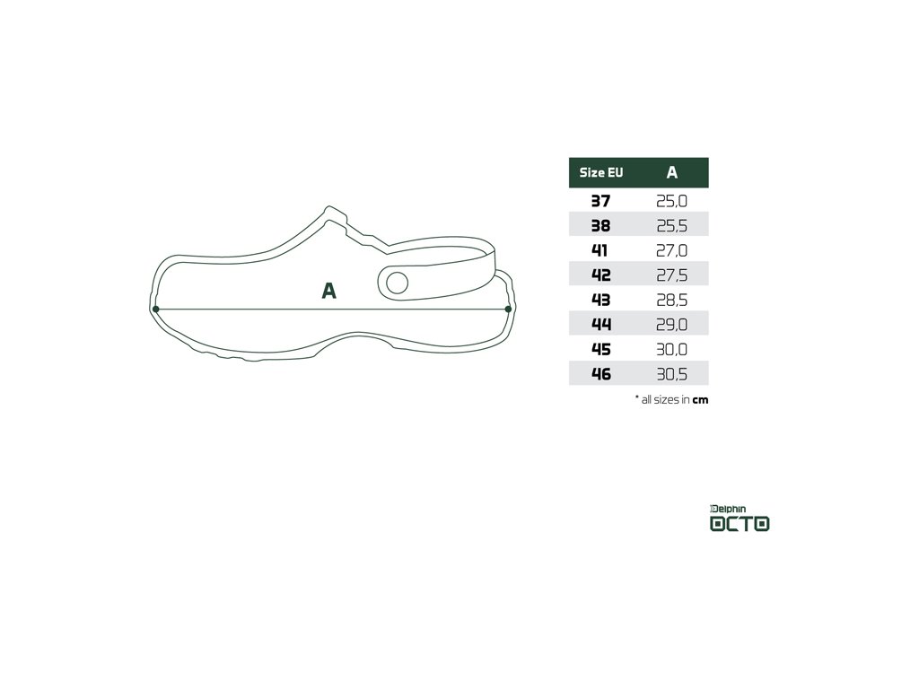 Od počátku vývoje tohoto produktu bylo naším záměrem přinést designově jedinečné vsuvky, které budou splňovat požadavky rybářů na maximální funkčnost a komfort během nošení nejen na rybách, ale i v běžném životě. A výsledek? Delphin OCTO - ultra lehké pantofle z EVA pěny, inspirované přírodou, kompletně navrženy a vyráběny v Evropské unii! Vzhledem k tomu, že během rybolovu je nutné často chodit po nerovném terénu, jsme se při vývoji zaměřili na podešev, která je podstatně pevnější a masivnější ve srovnání s levnějšími konkurenčními modely. Právě to zaručuje, že chození v těchto vsuvkách bude maximálně komfortní a dokonale odfiltruje nerovnosti terénu. Při podešvi ještě chvíli zůstaneme. Právě tam začíná příběh názvu OCTO. Stylizovali jsme ji totiž do tvaru přísavek chapadel chobotnice, což zaručuje výborný grip za každých podmínek. Právě chobotnice, anglicky OCTOpus, anebo latinsky OCTOpod byly inspirací pro kompletní design a název ve zkrácené forme - OCTO. Dalším sofistikovaným prvkem jsou velké postranní otvory, jejichž prioritním úkolem je starat se o odvětrávání a celkovou vzdušnost v této obuvi. Záměrně nejsou navrženy ve výši podrážky, jak to bývá standardem, ale o něco výše. Právě tento detail hraje významnou roli během pobytu na břehu, či mělké vodě. Tím, že otvory jsou o něco vyšší nad vnitřní stélkou je téměř eliminováno nechtěné nabírání písku či kamínků mezi podrážku a chodilo. Vaše chodidla jsou tedy chráněny v maximální možné míře. Kromě těchto otvorů slouží k odvětrávání hustá perforace umístěna ve vrchní části. Ta je záměrně vytvarována na jedné straně do symbolu D z loga Delphin, na druhé vsuvce zase kraluje symbol O, jako počáteční písmeno názvu OCTO. Celkový dojem ještě zhodnocuje jemná struktura na povrchu pantoflí, která evokuje kůži chobotnice. Díky použitému EVA materiálu jsou mimořádně lehké, houževnaté a dokonce plovoucí. Samozřejmostí je u tohoto modelu poutko na fixaci paty (lidově nazývané i uzávěrka), které oceníte zejména v nerovné, či svahovitejšom terénu. Delphin OCTO jsou jednoduše stylovou letní obuví, jedinečného designu, s velmi širokým využitím. Ať už potřebujete přezůvky do interiéru, jít na ryby, vykoupat se, neboli do města. OCTO jsou tu aby vás převedli všemi nástrahami dne komfortně a s lehkostí. Jediným mínusem je, že nejsou vhodné pro vysokohorskou turistiku, to však díky ostatní všestrannosti určitě oželíte :) Jelikož jsou pantofle vyrobeny z EVA materiálu, vedle množství výhod třeba dbát i na péči o tento materiál. Nenechávejte ho proto vystaven dlouhodobě přímému prudkému slunečnímu záření na rozpálených kamenech či betonu. Právě tam může teplota atakovat až 50 stupňů Celsia, což může způsobit jemné tvarové deformace. Samozřejmě, pokud jsou pantofle na nohách, k takovému jevu nedochází a životnost se počítá na roky.