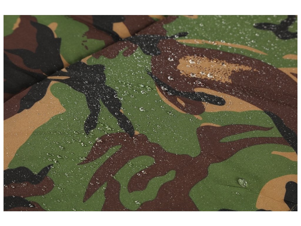 Na vnější vrstvu, byl použit velmi příjemný a nešustící materiál „ Peach Skin “ broskvová kůže, který je v atraktivním kamuflážovém provedení. Tento materiál má tyto vlastnosti, je nepromokavý, ale při tom dýchá a odvádí přebytečnou vlhkost. Plně prošívaný microfleece tmavě zelené barvy, je vyplněn 100% dutým vláknem pro extrémní teplo a komfort. Zipy jsou po obou stranách, lze je rozepnout až k nohám a jsou izolovány, jak z vnitřní, tak vnější strany, aby se zabránilo nežádoucímu úniku tepla.