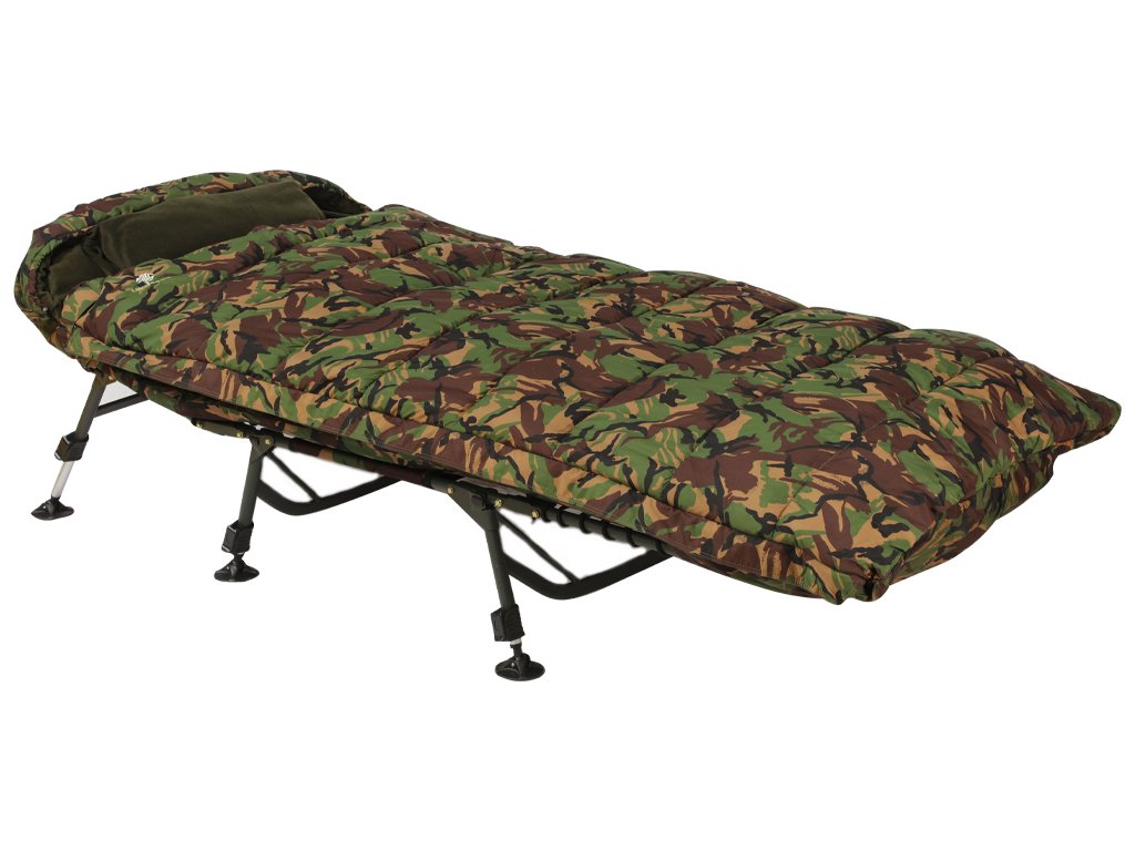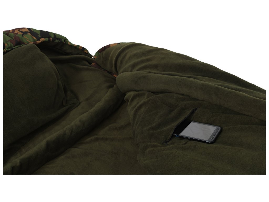 Ve vnitřní části spacího pytle, naleznete kapsu na zip, která je určena pro mobilní telefon, či doklady. Pod hlavou je na zip odnímatelný polštářek, který zajistí opravdový komfort. Na obou stranách spacího pytle (u hlavy a nohou) jsou ze spodu našité převleky, které se pouze přetáhnou přes vršek a spodek lehátka a zajistí tak neomezený a bezpečný pohyb. Ve střední části spacího pytle je popruh, který se díky přezce snadno upevní k lehátku a zabrání kroucení spacího pytle. Spací pytel je dodáván s přenosnou a zesílenou kompresní taškou v kamuflážovém provedení, jako samotný spací pytel.
