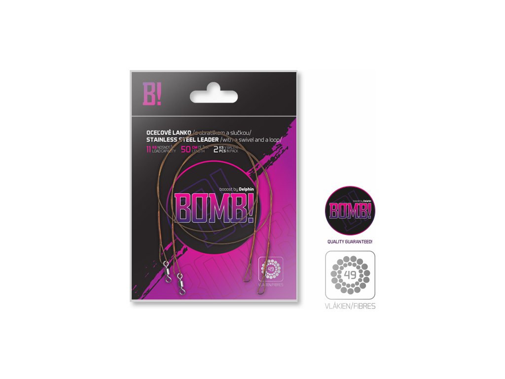 Ocelové lanko přívlačové řady BOMB! od značky Delphin je zhotovené pletením až neuvěřitelných 49 vláken (označovaných také jako 7x7) z nerezavějící ocele. Toto lanko je specifické svojí výjimečnou jemností, ale i nekompromisní odolností vůči ostrým zubům a překážkám! Díky vlastnostem tohoto lanka je s ním jakákoliv manipulace velmi příjemná a lehká. Navíc jeho materiálové složení umožňuje nástrahu prezentovat na špičkové úrovni i těm nejopatrnějším predátorům! Na jedné straně lanka BOMB! se nachází obratlík a na druhé smyčka. V každém balení se nachází až 2 kusy tohoto odolného lanka! Velikosti obratlíků k jednotlivým lankům: - 50cm/11kg- obratlík # 6 - 60cm/14kg- obratlík # 5