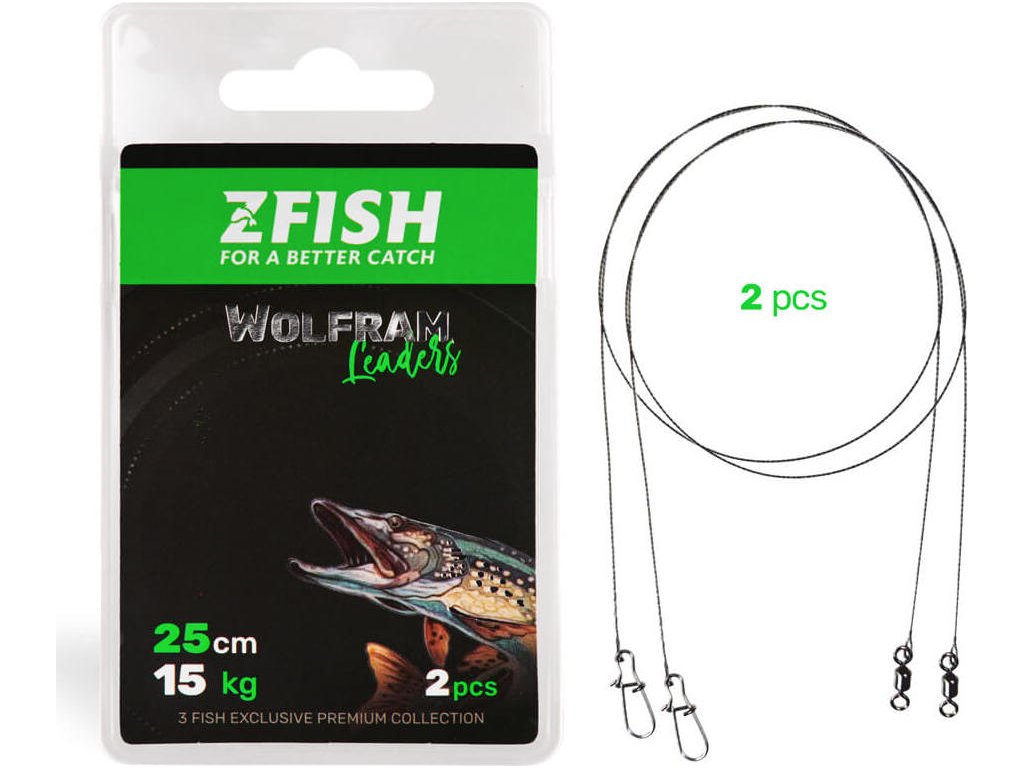 ZFISH Wolfram Leader jsou wolframová lanka pro lov dravců z prémiové řady “3Fish”, takže o jejich kvalitě a spolehlivosti není pochyb. Jsou vyrobena z kvalitního wolframu s velmi malou tvarovou pamětí, takže nehrozí, že je po prvním útoku dravce, budete muset vyhodit. Spojky použité u těchto lanek, jsou vyrobené z velmi kvalitní oceli a jsou sevřené tak precizně, že nehrozí, že by se uvolnily například při tažení nástrahy z vázek, jak se často stává u méně kvalitních lanek.