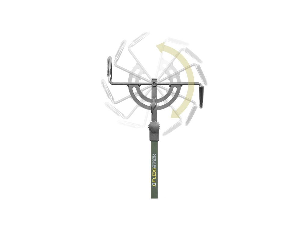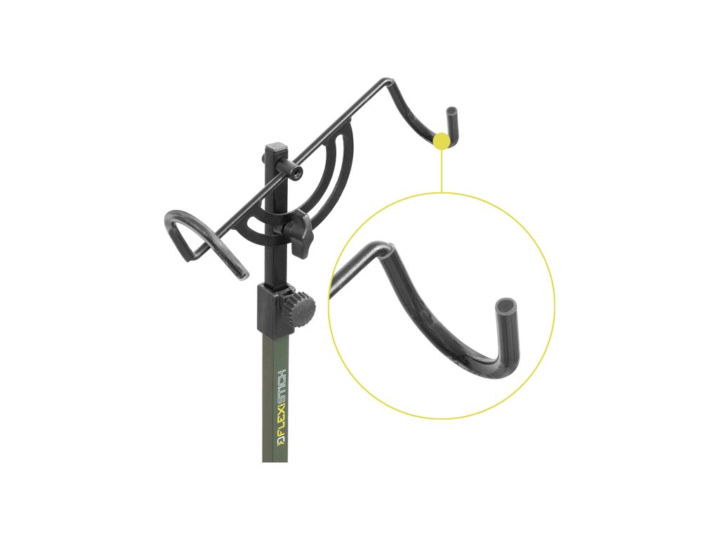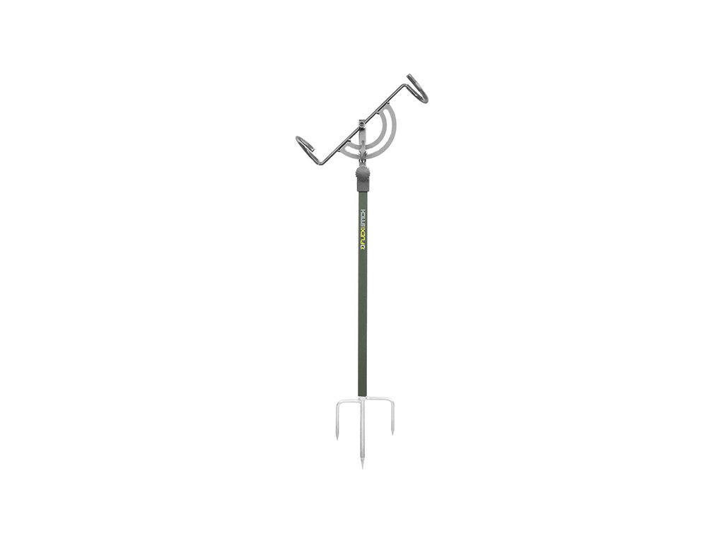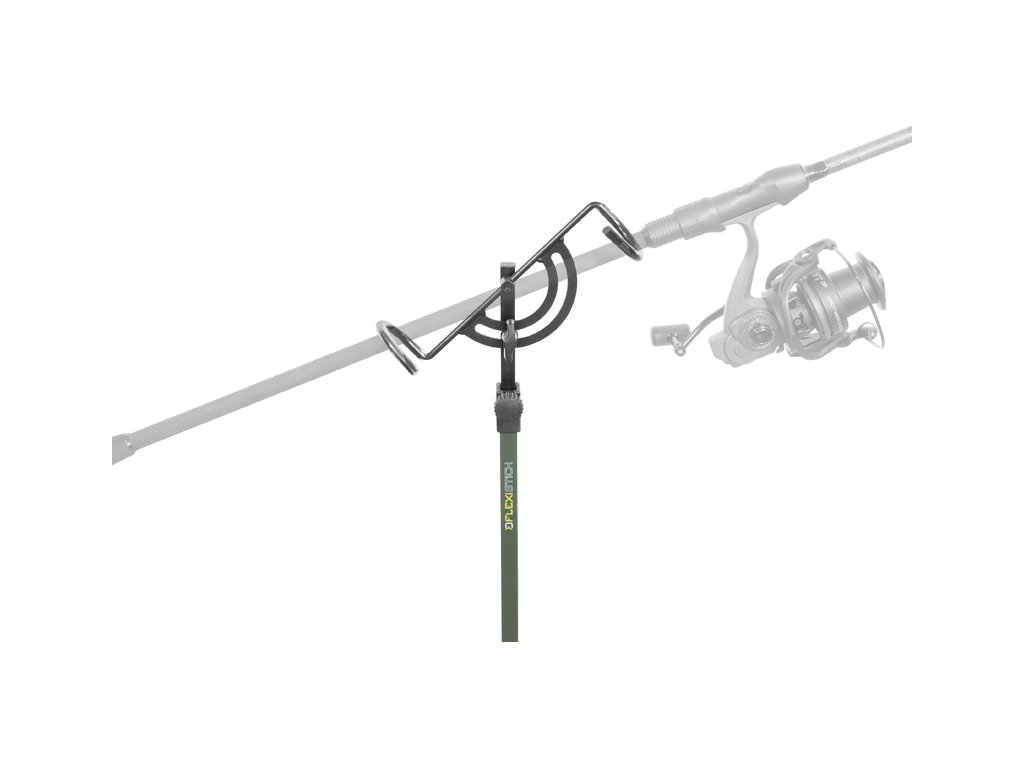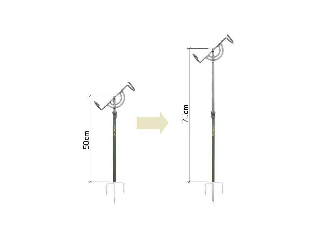 Univerzální teleskopický držák na prut, využitelný pro většinu rybolovných technik. Vrchní část držící prut je vyformována z hrubého a pevného drátu černé barvy, který je specificky zahnutý tak, aby do něj bylo možné zasunout jakýkoli rybářský prut. Přední i zadní zahnutí je navíc potaženo gumou, což zamezí posouvání a zabrání poškození prutu. Držák je také polohovatelný pomocí kyvadlového mechanismu, takže si jej můžete nastavit do různých úhlů, ať už špičkou ke hladině, vodorovně nebo téměř kolmo vzhůru. Teleskopickou tmavě zelenou tyč lze vysouvat podle potřeby a navíc má čtvercový tvar, čili nehrozí nechtěné přetáčení prutu. Zapíchnutí do země je umožněno pomocí mohutného kovového trojzubce, který je mimořádně pevný, snadno proniká i tvrdším povrchem a lze jej zašlápnout nohou, případně zabít gumovým kladivem do půdy. Navíc je celá spodní část upevněna pomocí závitu a lze ji odšroubovat a skladovat odděleně. Technické parametry: Minimální výška: 50cm Maximální výška: 70cm