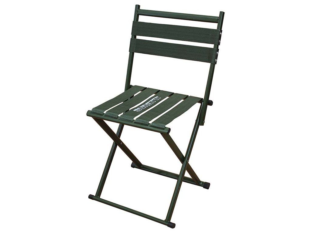 Jednoduchá stolička, klasický kříž s opěradlem z ocelových trubek průměru 26x16 mm a nylonových popruhů místo celtoviny. Díky těmto použitým materiálům má stolička vysokou nosnost 200kg a je překvapivě pohodlná a lehká. Váží jen 2kg. Rám je komaxitovaný zelenou barvou a popruhy jsou upevněny uvnitř rámu pomocí ocelového drátu. Výška sedačky je po rozložení 41cm a sedák má 35 × 35cm. Celková výška i s opěradlem je 75cm.