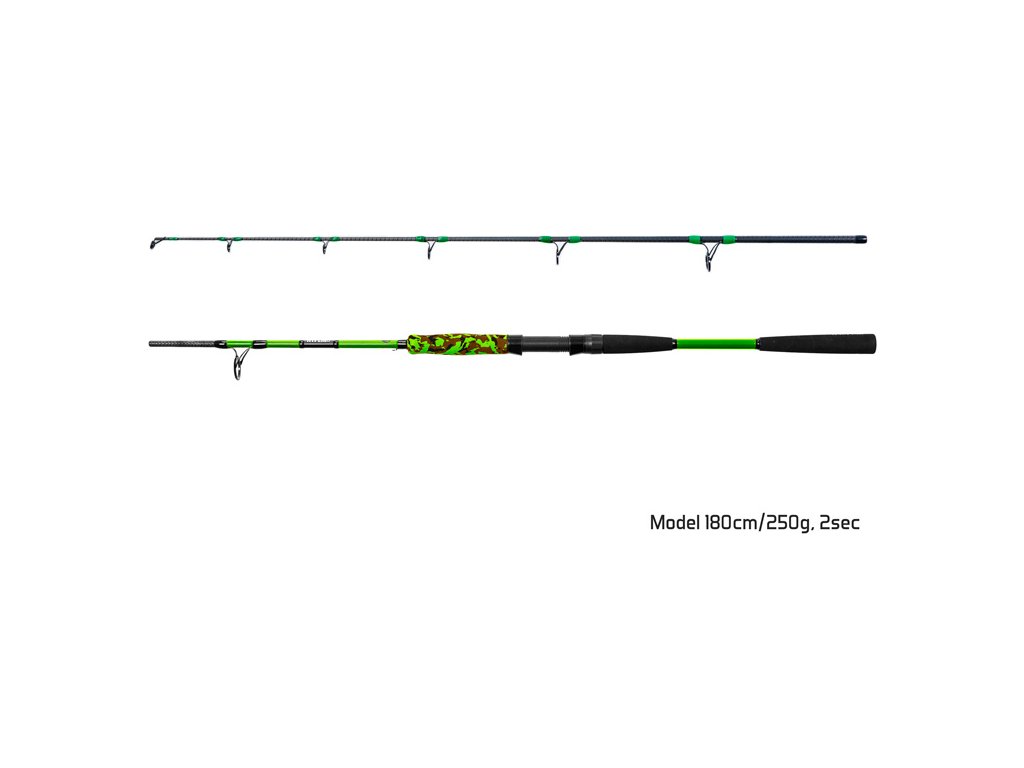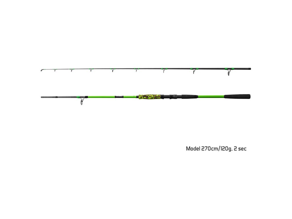 Nová generace prutu HYPERIO je zaměřena na aktivní lov sumců těžkou přívlačí ze břehu nebo z člunu. Novinka vás na první pohled zaujme svým novým a propracovaným designem. Gramáž poskočila na 120g vyztužením blanku a díky technickým inovacím přináší rovnoměrné rozdělení síly. HYPERIO představuje lehký ale silný prut, určený pro vrhání zátěží kolem 120g. Nedělá mu problém sladkovodní, ani mořský rybolov. Postaven byl totiž na vyhrávání soubojů s dravými rybami. Už při navrhování jsme dbali na výjimečně silný blank se zpevňujícím karbonovým opletem PowerWrap, který je velmi pevný a výborně pracuje při nahazování či zdolávání. Zesílená očka prutu jsou vyvázaná s vysokým důrazem na celkovou odolnost a vysoké namáhání. Výplň oček si výborně poradí jak s vlascem, tak i se šňůrou. Model: 180cm / 120g Počet dílů: 2 Průměr blanku nad rukojetí: 10,44mm Počet oček: 7 Transportní délka: 95cm Hmotnost: 196g Rukojeť: dělená, EVA pěna Délka rukojeti (od spodní části prutu po střed sedla): 43,5cm Model: 210cm / 120g Počet dílů: 2 Průměr blanku nad rukojetí: 11,50mm Počet oček: 8 Transportní délka: 111cm Hmotnost: 221g Rukojeť: dělená, EVA pěna Délka rukojeti (od spodní části prutu po střed sedla): 46,5cm Model: 240cm / 120g Počet dílů: 2 Průměr blanku nad rukojetí: 12,87mm Počet oček: 9 Transportní délka: 125cm Hmotnost: 244g Rukojeť: dělená, EVA pěna Délka rukojeti (od spodní části prutu po střed sedla): 48,5cm Model: 270cm / 120g Počet dílů: 2 Průměr blanku nad rukojetí: 13,40mm Počet oček: 10 Transportní délka: 141cm Hmotnost: 274g Rukojeť: dělená, EVA pěna Délka rukojeti (od spodní části prutu po střed sedla): 50,5cm