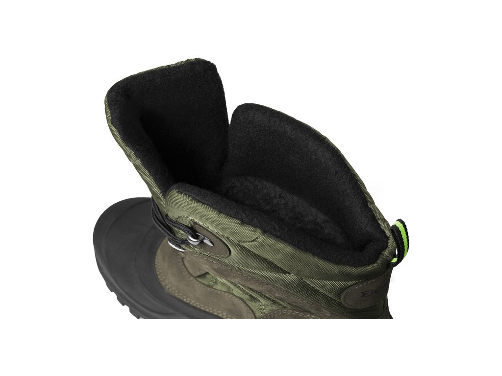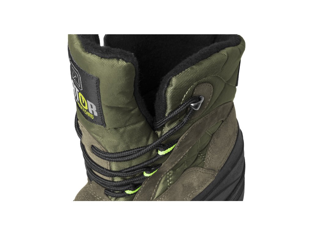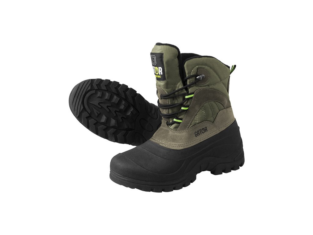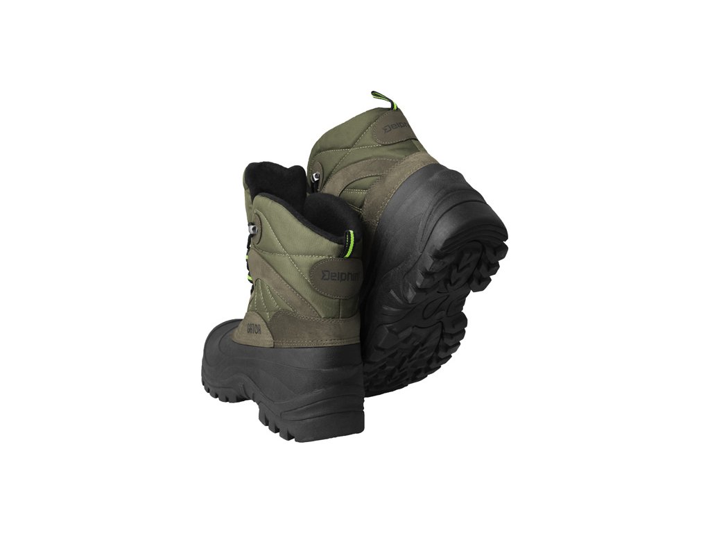 Boty Delphin GATOR jsou určeny na extrémní výpravy zejména v chladnějších obdobích roku. Zvýšený gumový lem podrážky sahá až do výšky kotníků, to znamená, že chůze v loužích, rozbředlém sněhu a blátě není pro GATOR problém. Tato pryžová část se navíc velmi dobře čistí. V zadní části gumové části boty se nachází výstupek, díky kterému si botu bez problémů zujete. Svršek boty je tvořen kombinací odolné nylonové látky a umělé kůže. Tyto materiály dobře odolávají nepřízni počasí a jednoduše se v případě potřeby impregnují. Jazyk boty je přišitý až do výšky 17cm, to znamená, že krátkodobě se můžete pohybovat v takto hlubokých vlhkých oblastech. Šněrování je řešeno přes textilní očka, na vrchu šněrování se nachází jedno kovové oko. Vnitřek boty je tvořen příjemným mikrofleecovým materiálem. O tepelné pohodlí se postará vrstva umělého mikrovlákna mezi vnější a vnitřní vrstvou. Černo-zelenou kombinaci materiálů ocení nejen rybáři, ale i myslivci, turisté a všichni ostatní milovníci přírody. I přes svou mohutnost jsou boty velmi lehké, což jistě přijde vhod při dlouhodobější chůzi. Například obě boty velikosti 43 váží pouze 1200g.