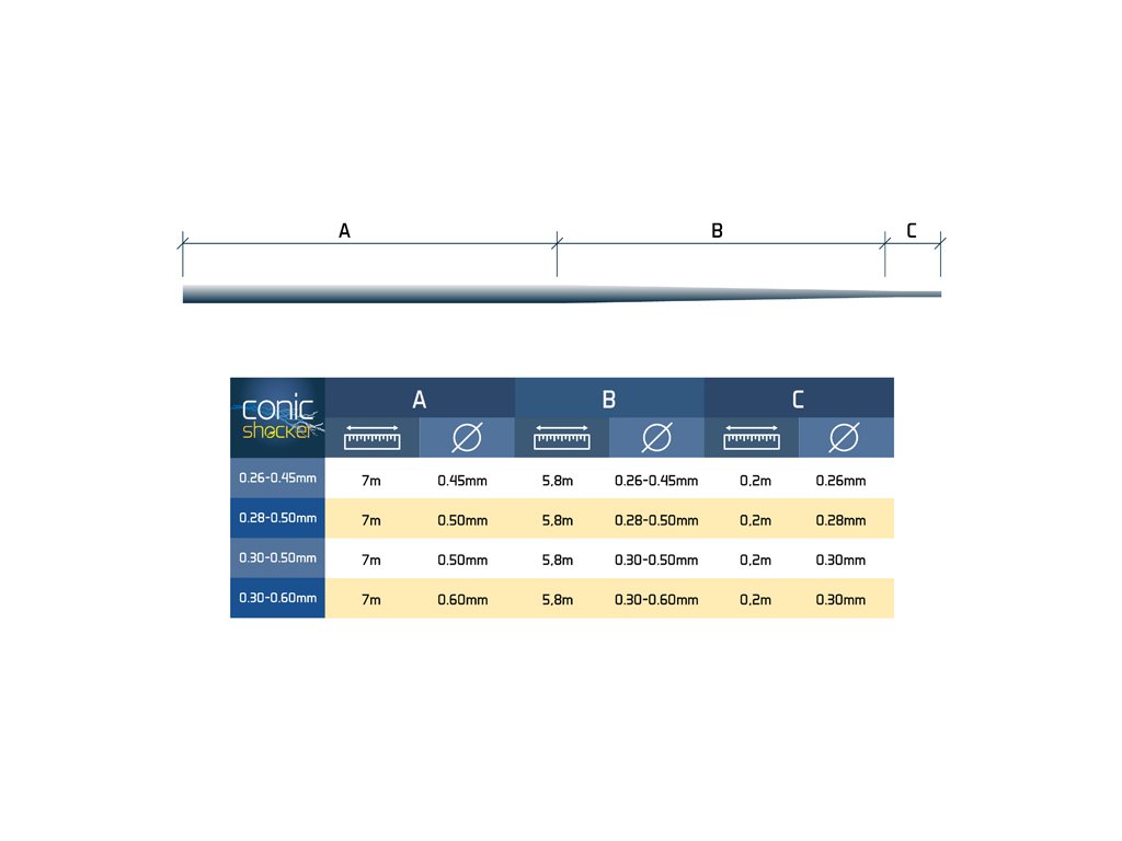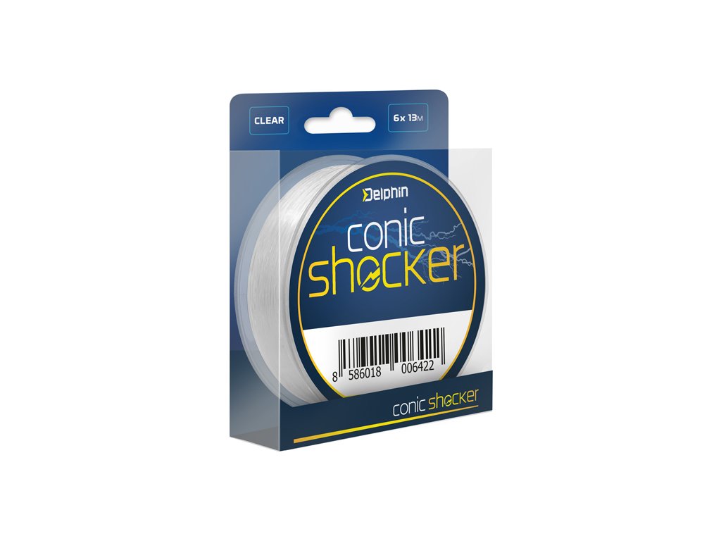Delphin Conic SHOCKER je kónický šokový vlasec, díky kterému nahazování na velké vzdálenosti nabývá nového rozměru! Podstata kónicky zúženého vlasce spočívá v postupně se měnícím průměru, díky čemuž je možné spojit jej s kmenovým vlascem pomocí velmi malého uzlíku. Právě to je jedním z klíčových parametrů pro mnohem snazší odvíjení vlasce z cívky a pro hladký průchod očky. Na opačném konci je však dostatečně tlustý a pevný, aby bez problémů odolal překážkám pod vodní hladinou či výpadům velkých ryb. Zároveň se do prutu můžete opřít plnou parou, bez obav o odtržení koncové sestavy při krátkodobém přetížení během nahazování. Kombinace zmíněných faktorů zaručuje, že při nahazování budete schopni dopravit své montáže podstatně dále než při použití klasické „šokovky“ se stejným průměrem po celé délce. V balení na cívce se nachází navinutých 6 kusů návazců o délce 13 metrů, které jsou vždy označeny nálepkou. mm/lbs: 0.26mm-0.45mm – 10 lbs – 26 lbs 0.28mm-0.50mm – 12 lbs – 32 lbs 0.30mm-0.50mm – 14 lbs – 32 lbs 0.30mm-0.60mm – 14 lbs – 44 lbs