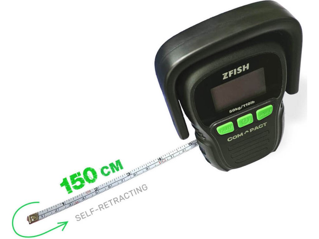Česká značka ZFISH přichází s novým, kompaktním modelem velmi přesné digitální váhy. Tato váha umožňuje precizní vážení Vašich úlovků v rozmezí od 20g až do 50kg s jednoduchým ovládáním pomocí tří tlačítek. Zapnutí a vypnutí probíhá stisknutím tlačítka ON/OFF. Krátkými stisky tlačítka UNIT změníte jednotky hmotnosti (kg, lbs, oz), na displeji. Funkce TARE umožňuje odečet hmotnosti vážících pomůcek jako jsou saky a tašky. Kromě těchto funkcí váha disponuje podsvíceným displejem, digitálním teploměrem a indikací stavu baterie a rizika přetížení. Váha Compact Scale je navíc opatřena 150 cm samonavíjecím pásmem, takže úlovek si nejen snadno zvážíte, ale také změříte jeho přesnou délku. Velkou výhodou při manipulaci je pevná, masivní, integrovaná rukojeť, kterou je navíc možné zasunout tak, aby měla váha co nejmenší rozměry při transportu.