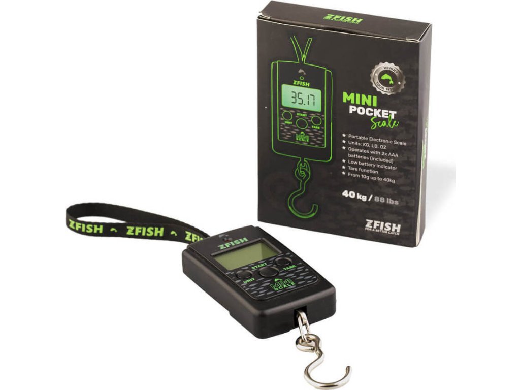 Česká značka ZFISH přichází s "MINI" modelem digitální váhy, která se Vám vejde do kapsy, takže bude vždy připravená do akce. Tato praktická, kapesní váha s jednoduchým ovládáním pomocí tří tlačítek umožňuje opravdu rychlé zvážení Vašich úlovků až do 40kg. Zapnutí a vypnutí probíhá stisknutím tlačítka ON/OFF. Krátkými stisky tlačítka UNIT změníte jednotky hmotnosti (kg, lbs, oz), Funkce TARE umožňuje odečet hmotnosti vážících pomůcek jako jsou saky, tašky a podobně.